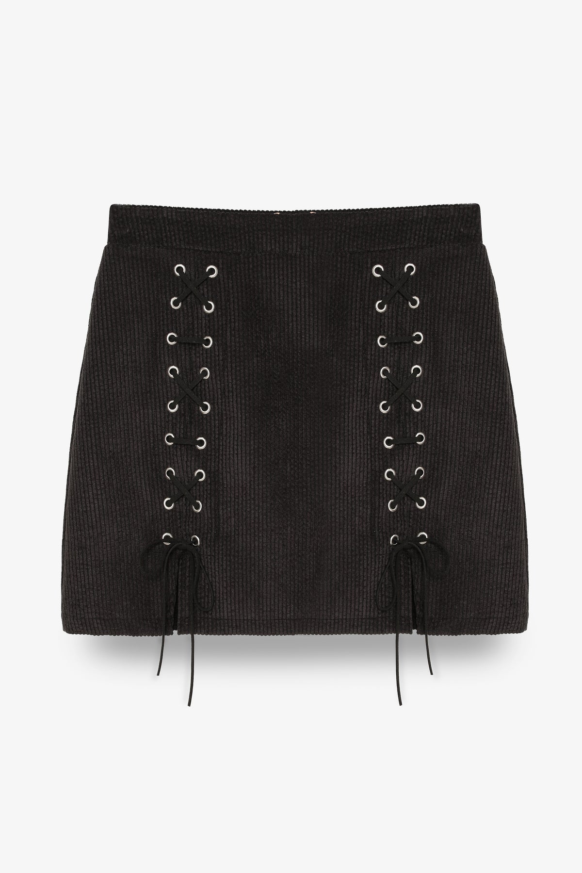 Bağcıklı Kadife Fitilli Mini Etek Siyah