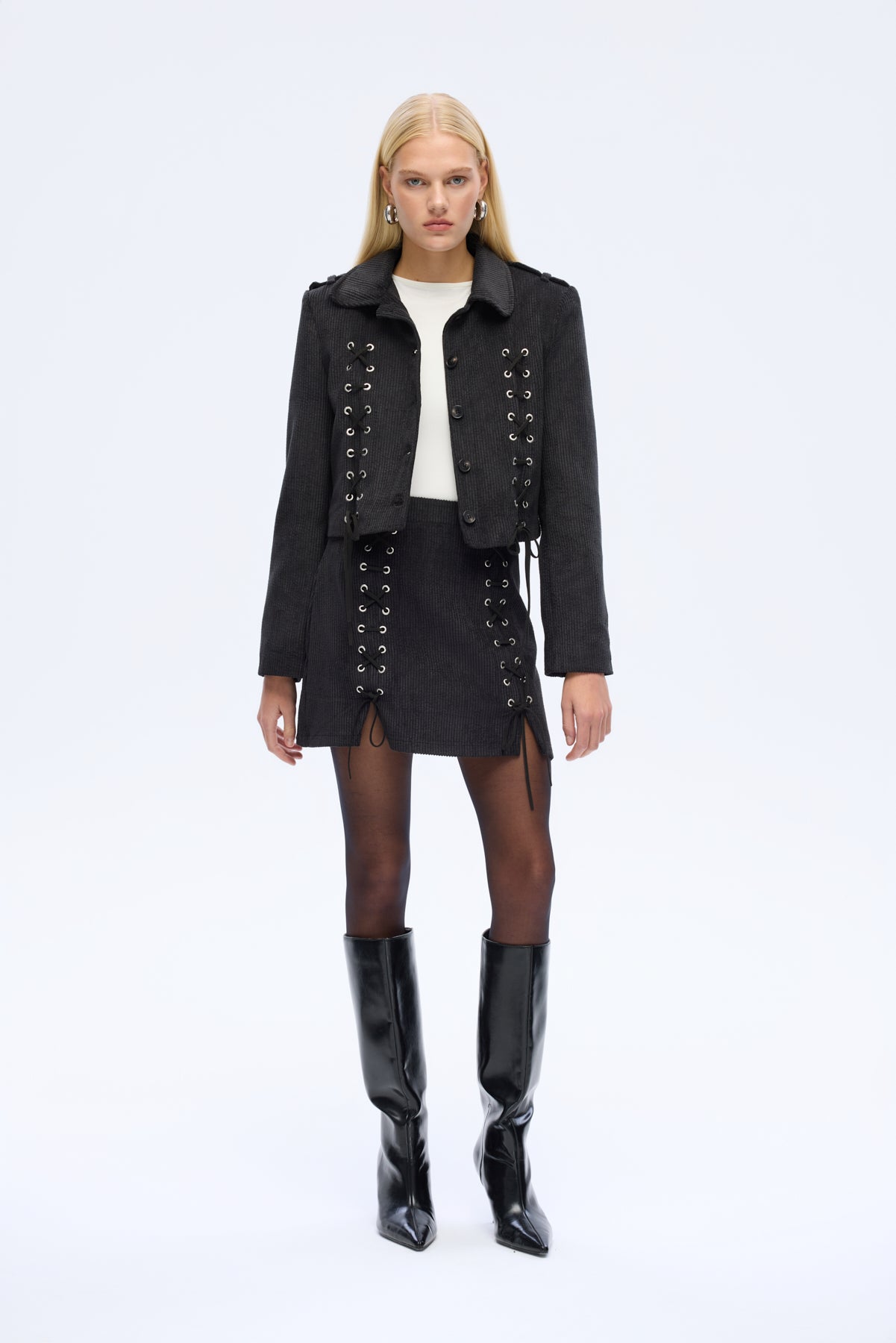 Ön kısmı metal halkalı bağcık bağlama süslemeli, beli yüksek, yandan fermuar kapamalı, fitilli kadife kumaştan mini boy etek.