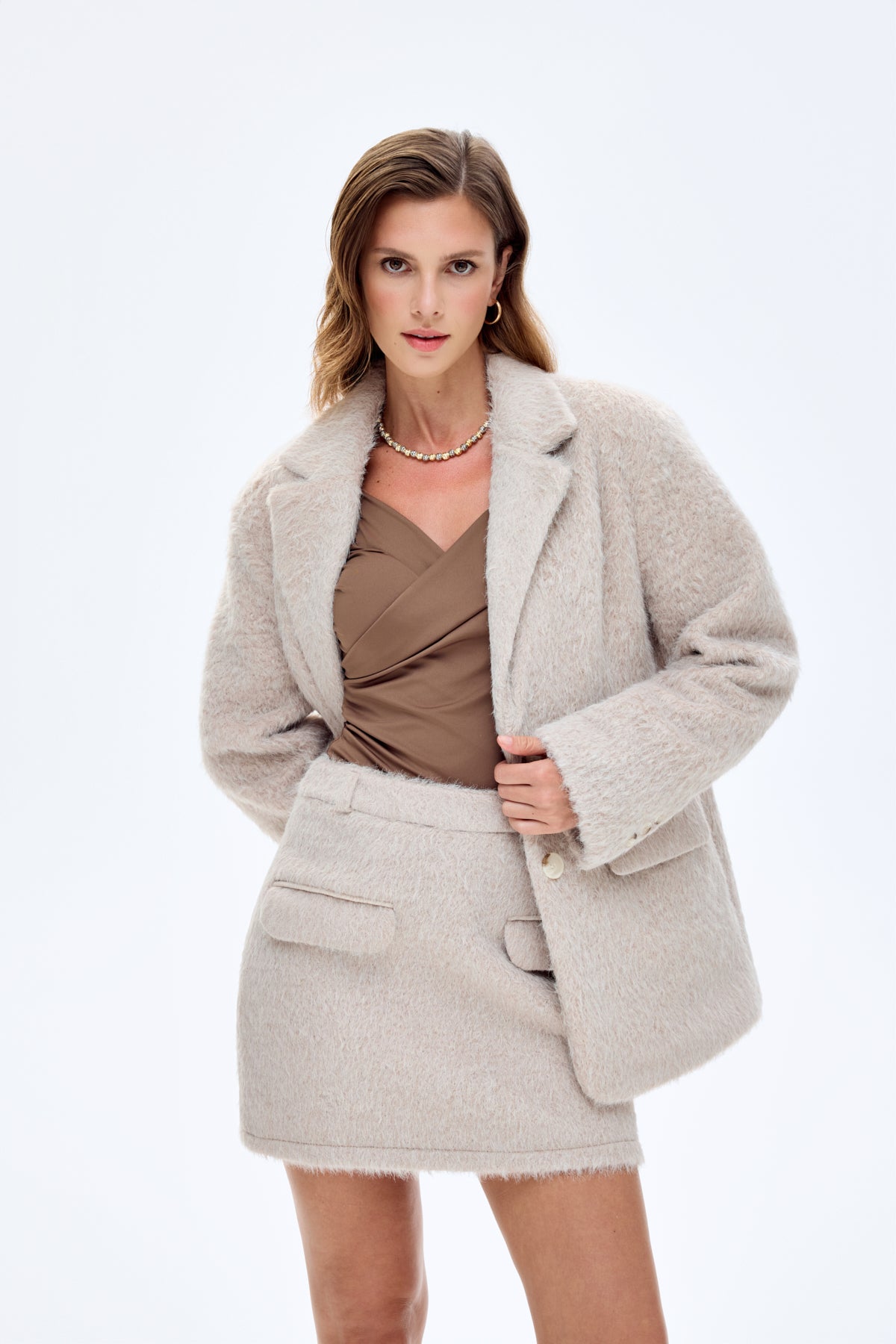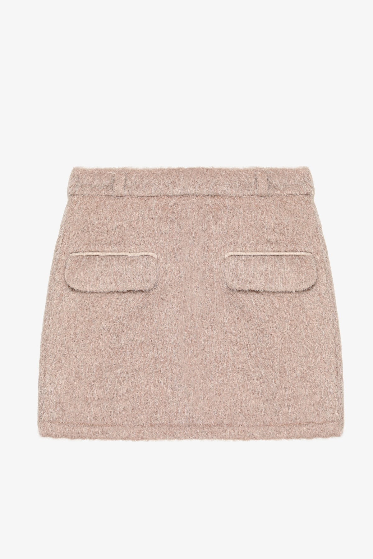 Cep Detaylı Tüylü Mini Etek Bej