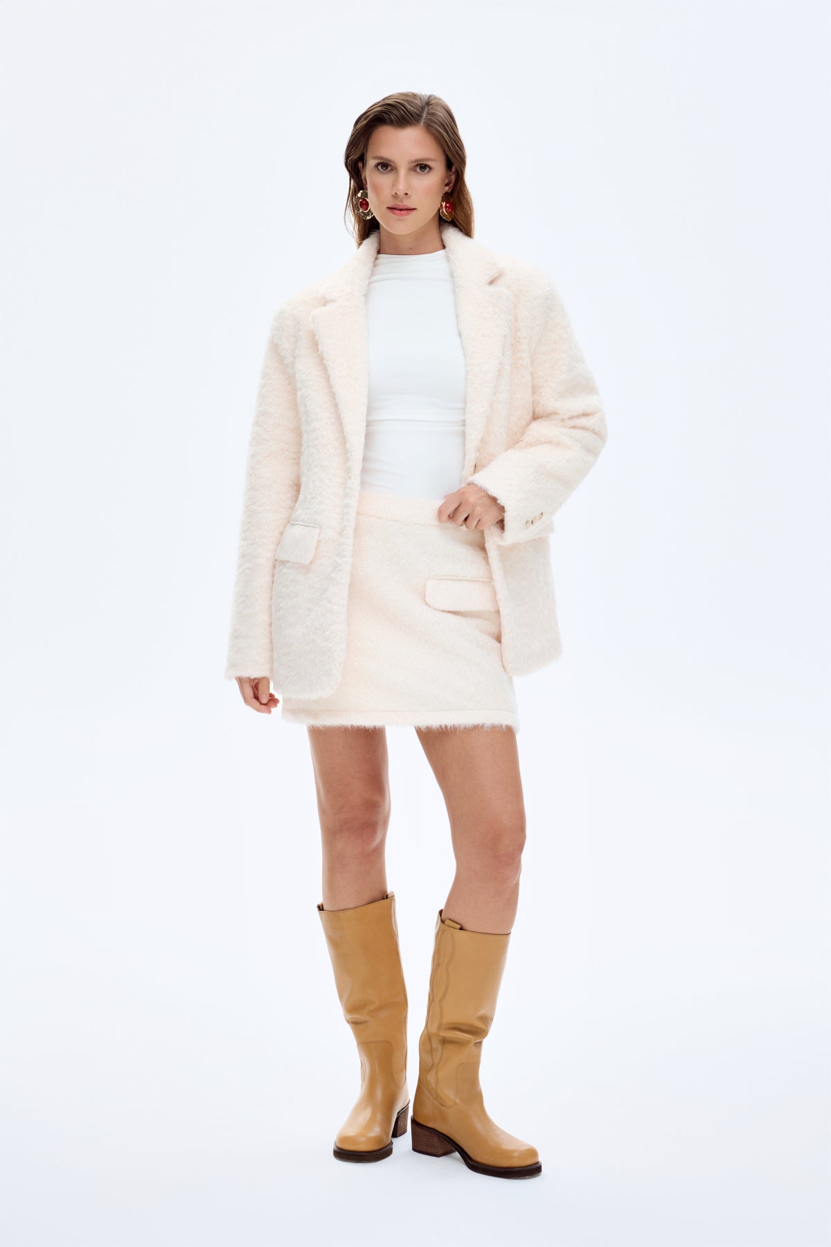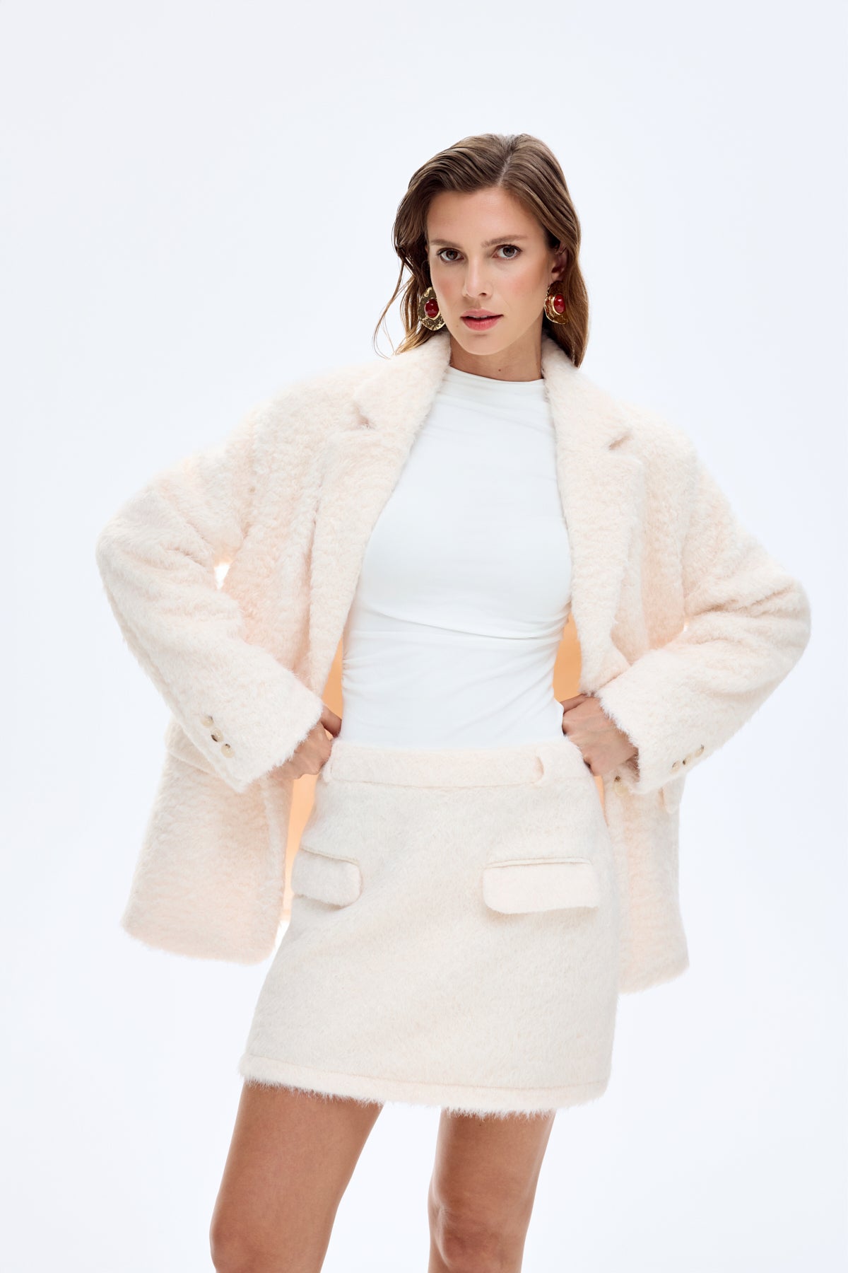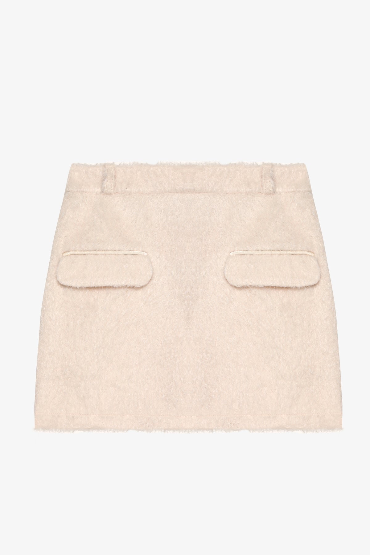 İçi astarsız, düz kesim, cep kapak detaylı, yandan fermuar kapamalı, modern görünüm sunan tüylü mini boy etek.