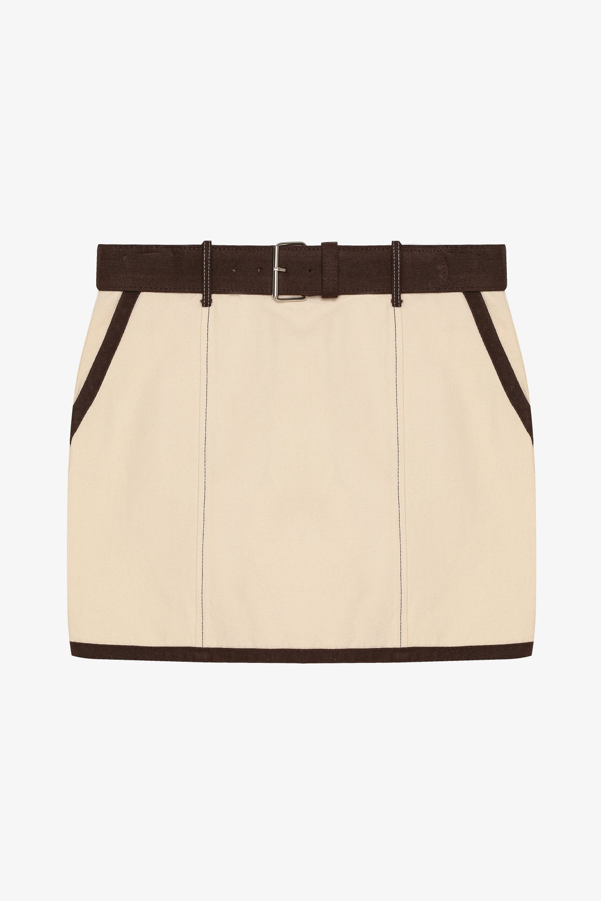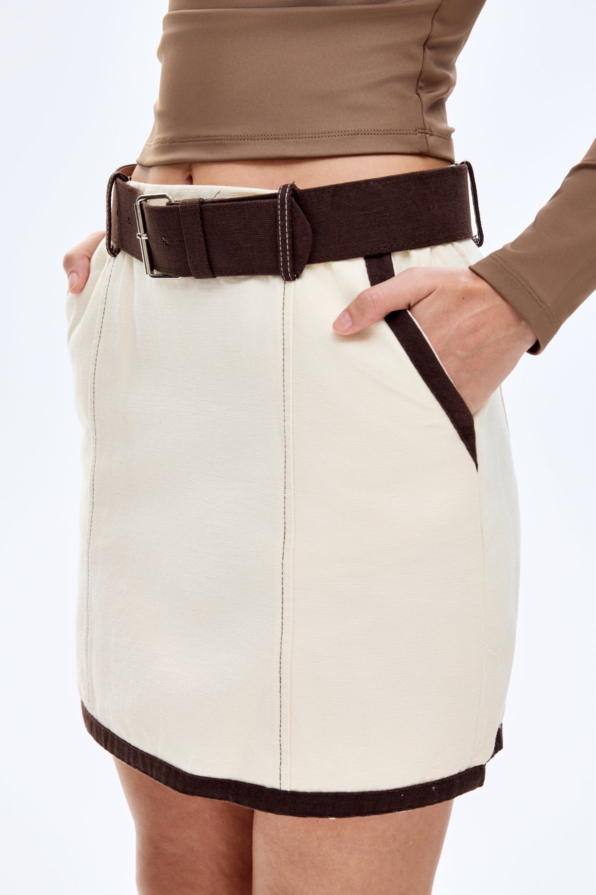 Kontrast Dikiş Detaylı Kemerli Mini Etek Bej