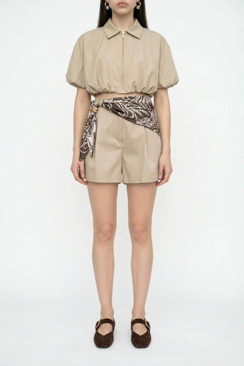 Yüksek Bel Fularlı Mini Şort Bej