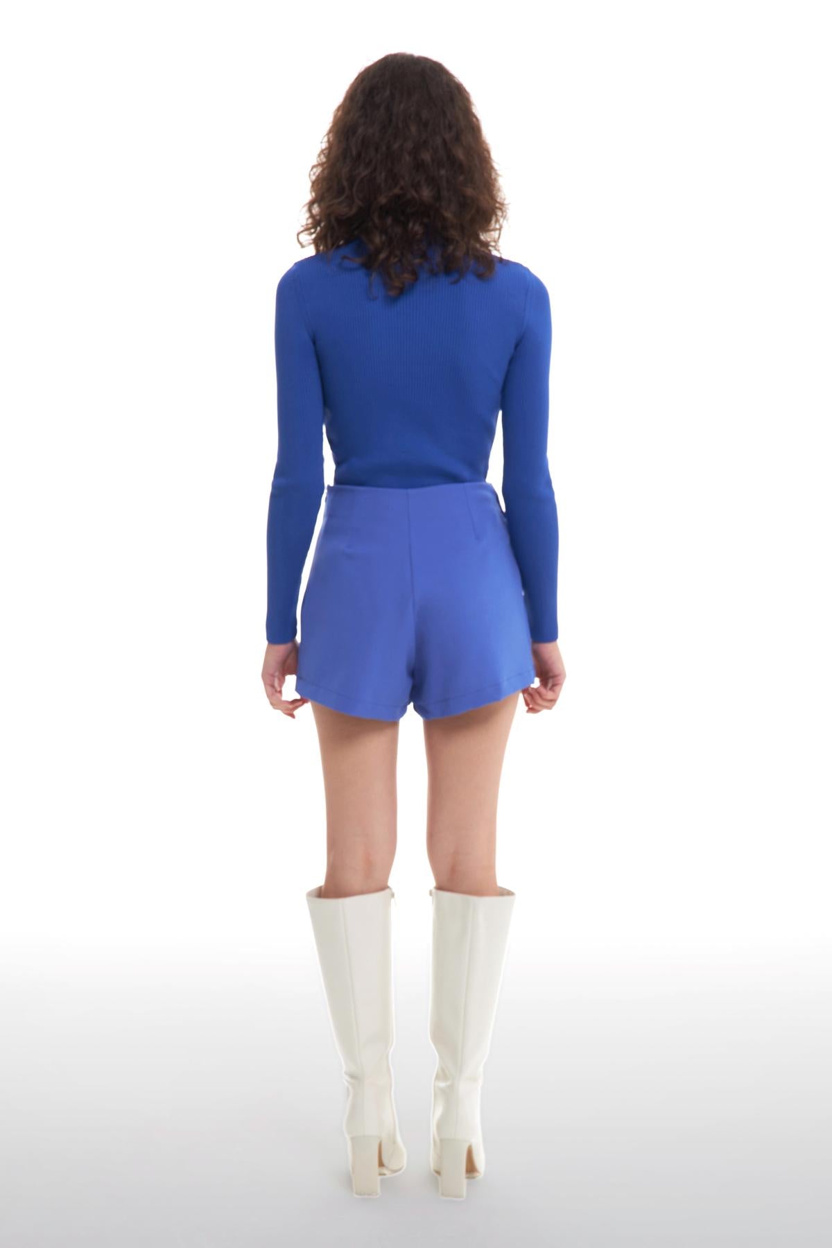 High waist, concealed side zip fastening, asymmetrical cut at the front, large button detail, mini shorts skirt.
