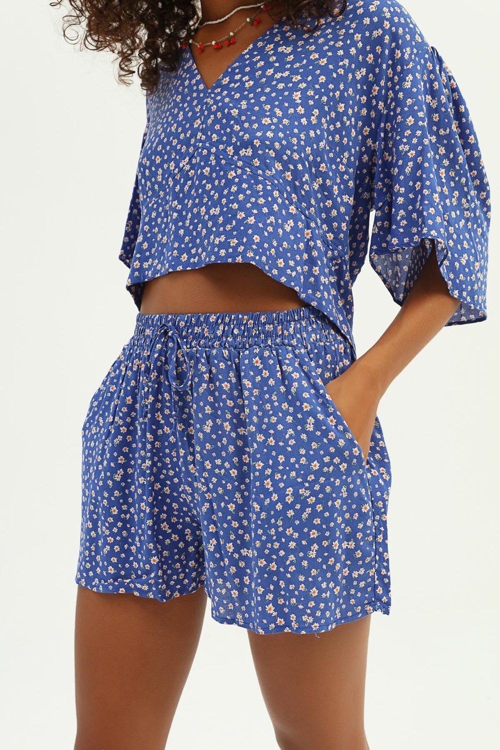 Floral Patterned Elastic Waist Shorts Sax