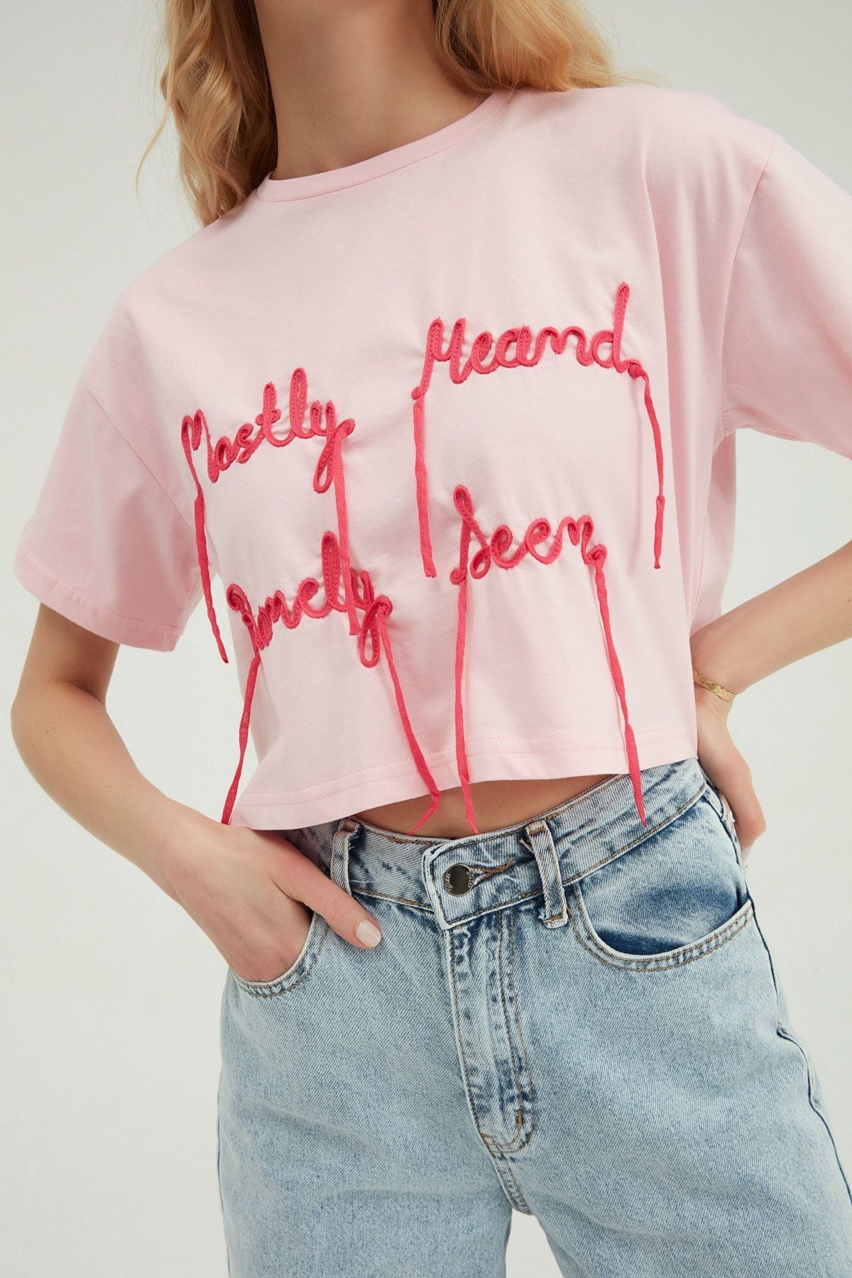 Embroidery Detailed Crop T-Shirt Pink