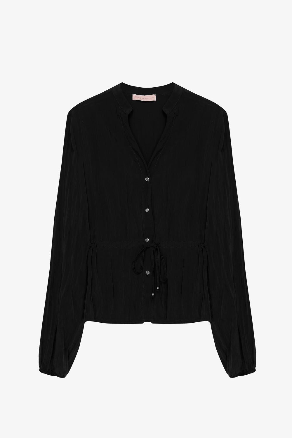 Bilek kısmı büzgü detaylı, önden düğmeli, v yaka, uzun kollu, dokulu buruşuk kumaştan, beli bağcıklı gömlek.