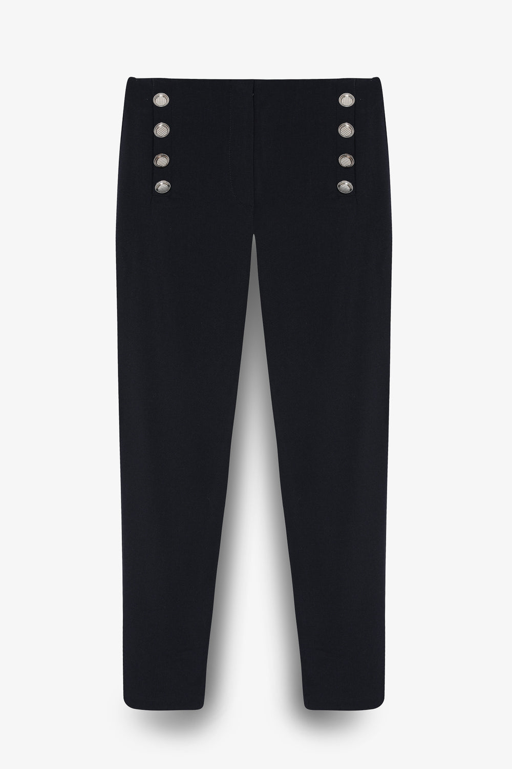 Yanları metal çift sıra düğme detaylı, beli fermuar kapamalı, cepli, yüksek bel, dar paça, klasik pantolon.
