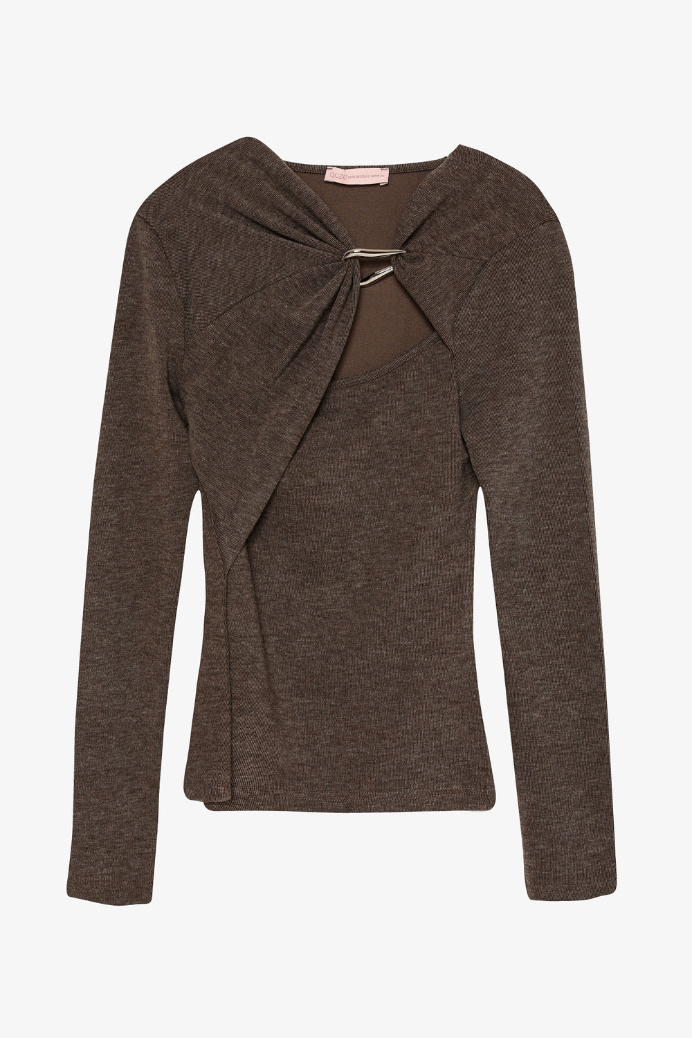 Halka Aksesuarlı Drapeli Asimetrik Yaka Bluz Kahverengi
