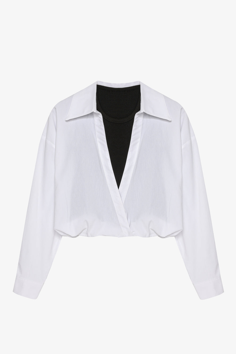 İçi kontrast renkli atlet garni görünümlü, gömlek formda, uzun kollu, kapamasız, kruvaze yaka bluz.