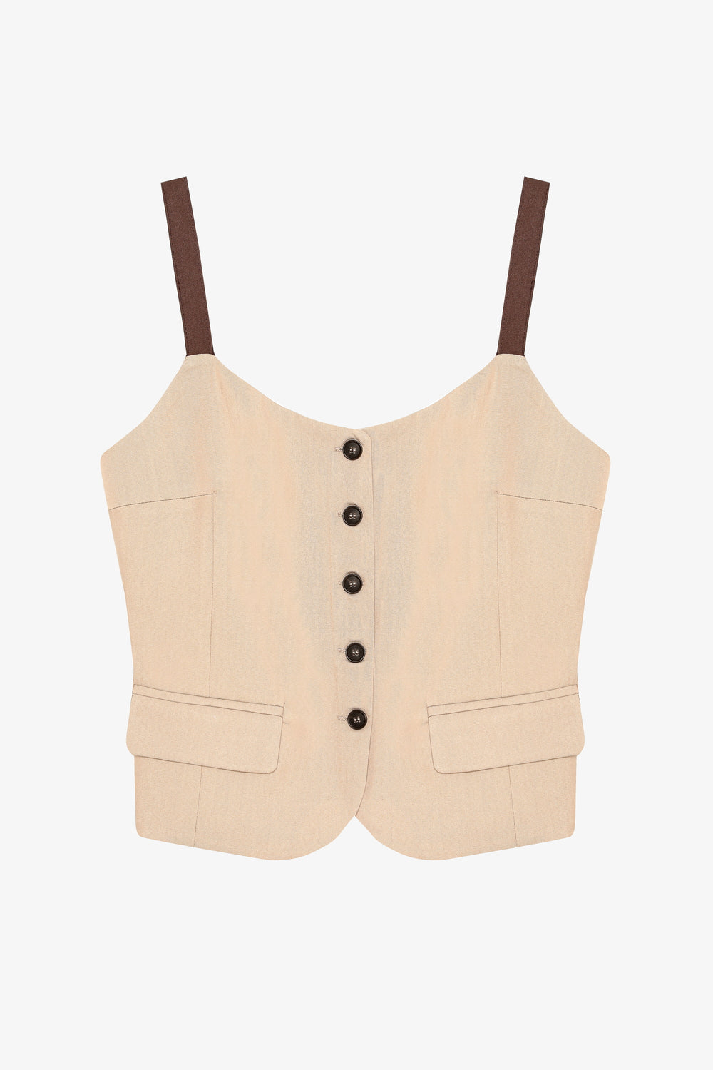 Kontrast Askılı Düğmeli Cep Detaylı Bluz Bej
