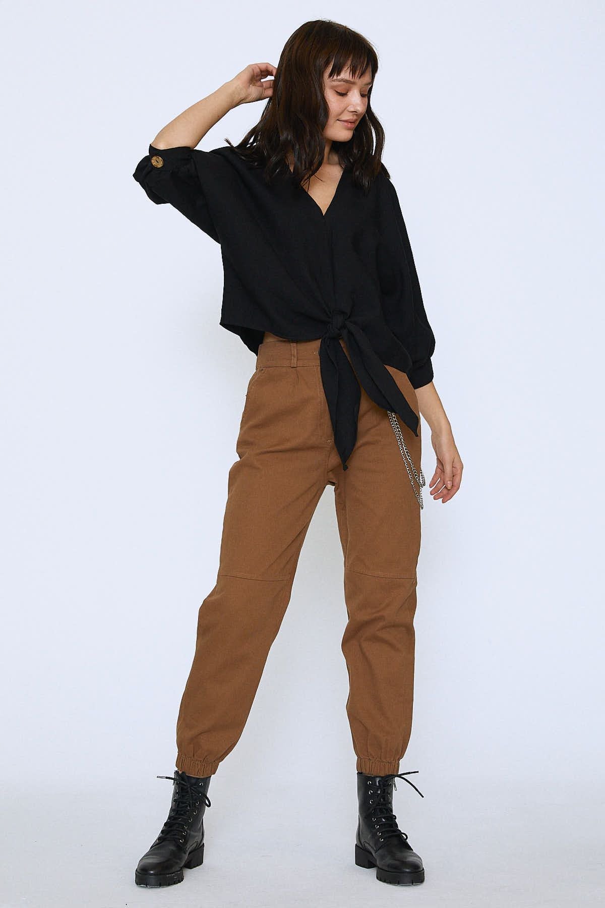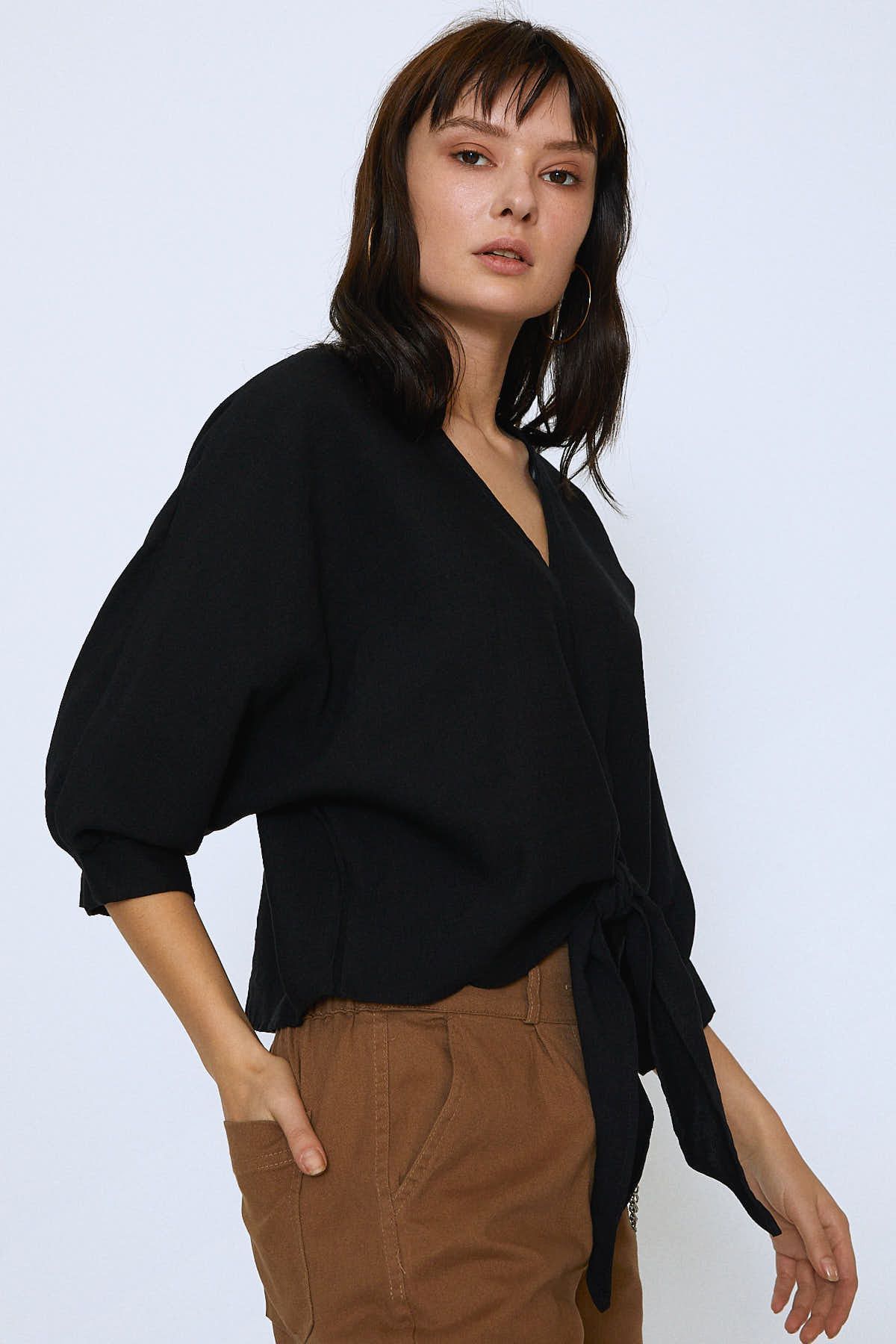 With its v-neck form, the waist-tie oversize blouse accompanies those who want to catch a fresh air throughout the day. Get a different mood every day with the blouse that you can combine with joggers and denim pants.