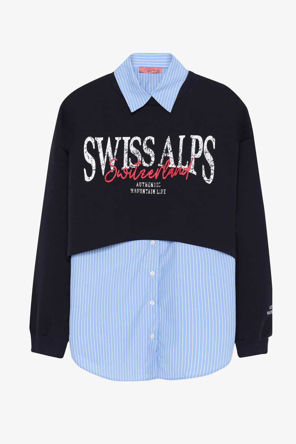 Çizgili Gömlek Garnili Yazı Baskılı Oversize Sweatshirt Mavi