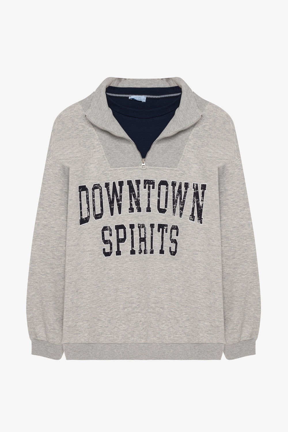 Fermuar Yaka Yazı Baskılı Oversize Sweatshirt Grimelanj