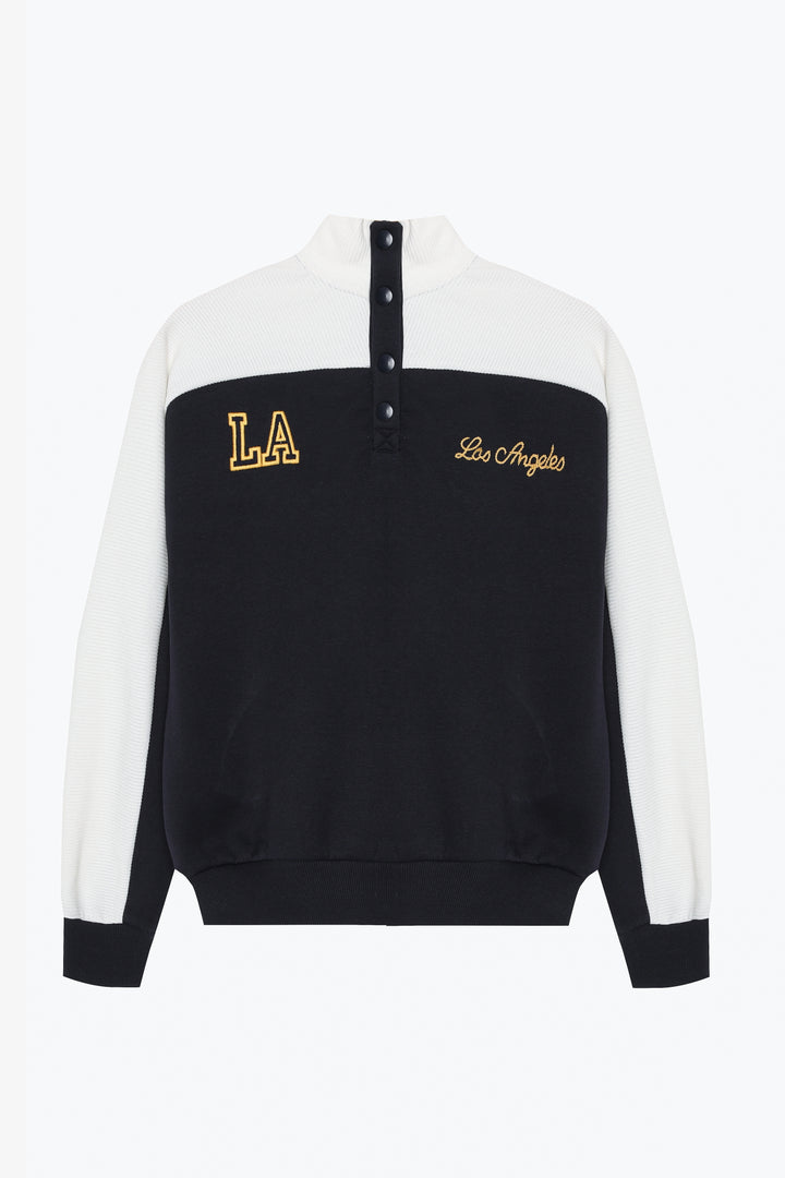 Ön kısmı ve sırtı yazı nakışlı, kontrast triko renk bloklu, yarım düğme kapamalı, uzun kollu, regular fit sweatshirt.