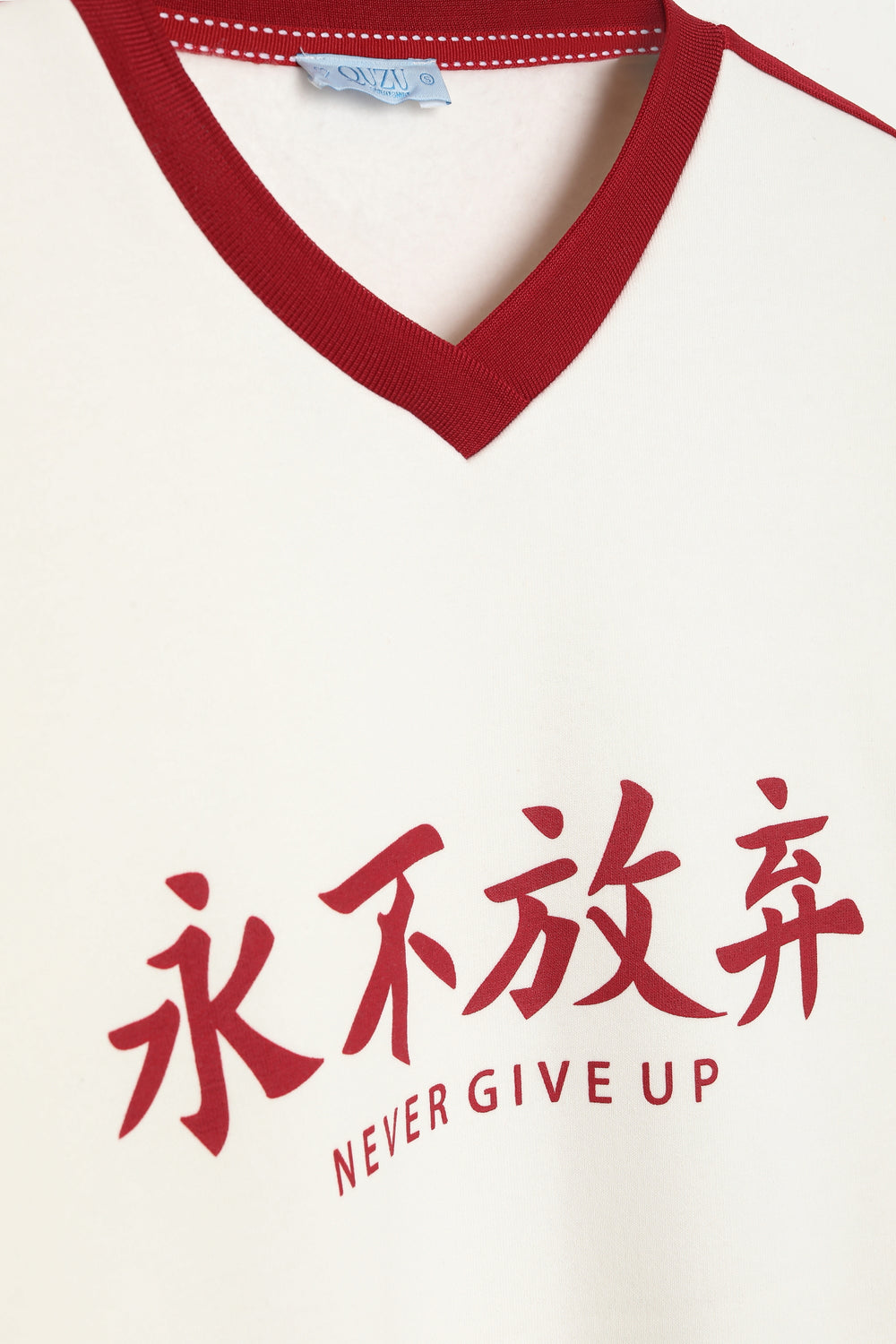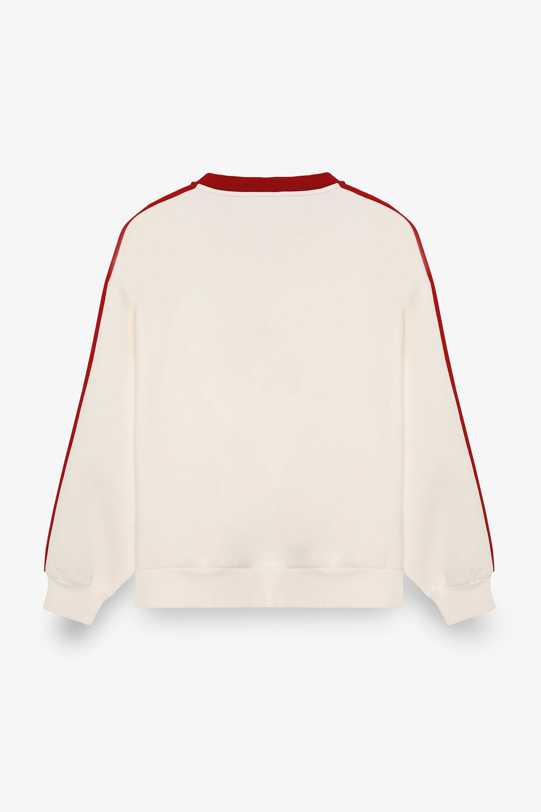 Şeritli Yazı Baskılı V Yaka Sweatshirt Ekru