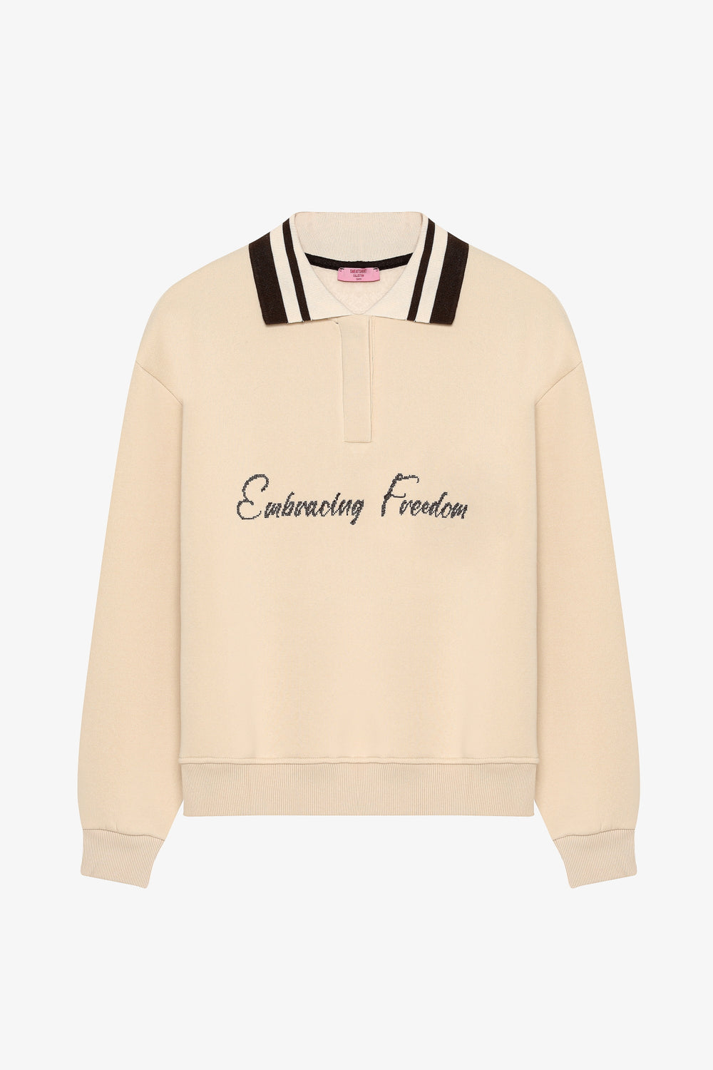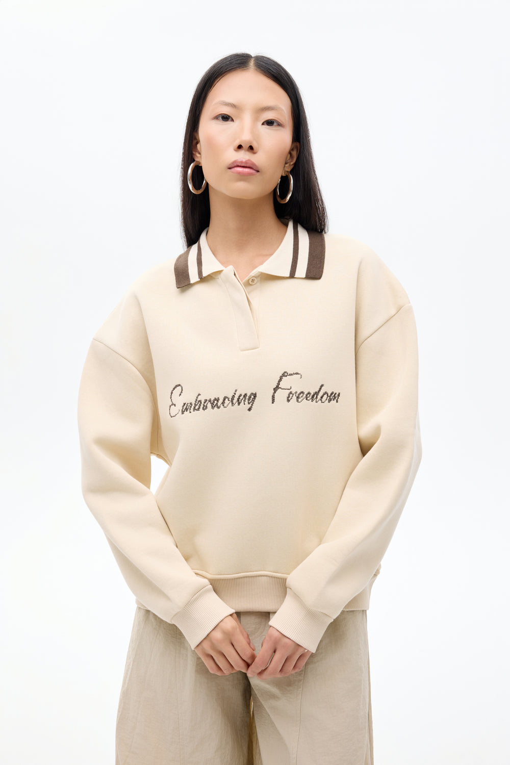 Yazı Nakışlı Şeritli Polo Yaka Oversize Sweatshirt Bej