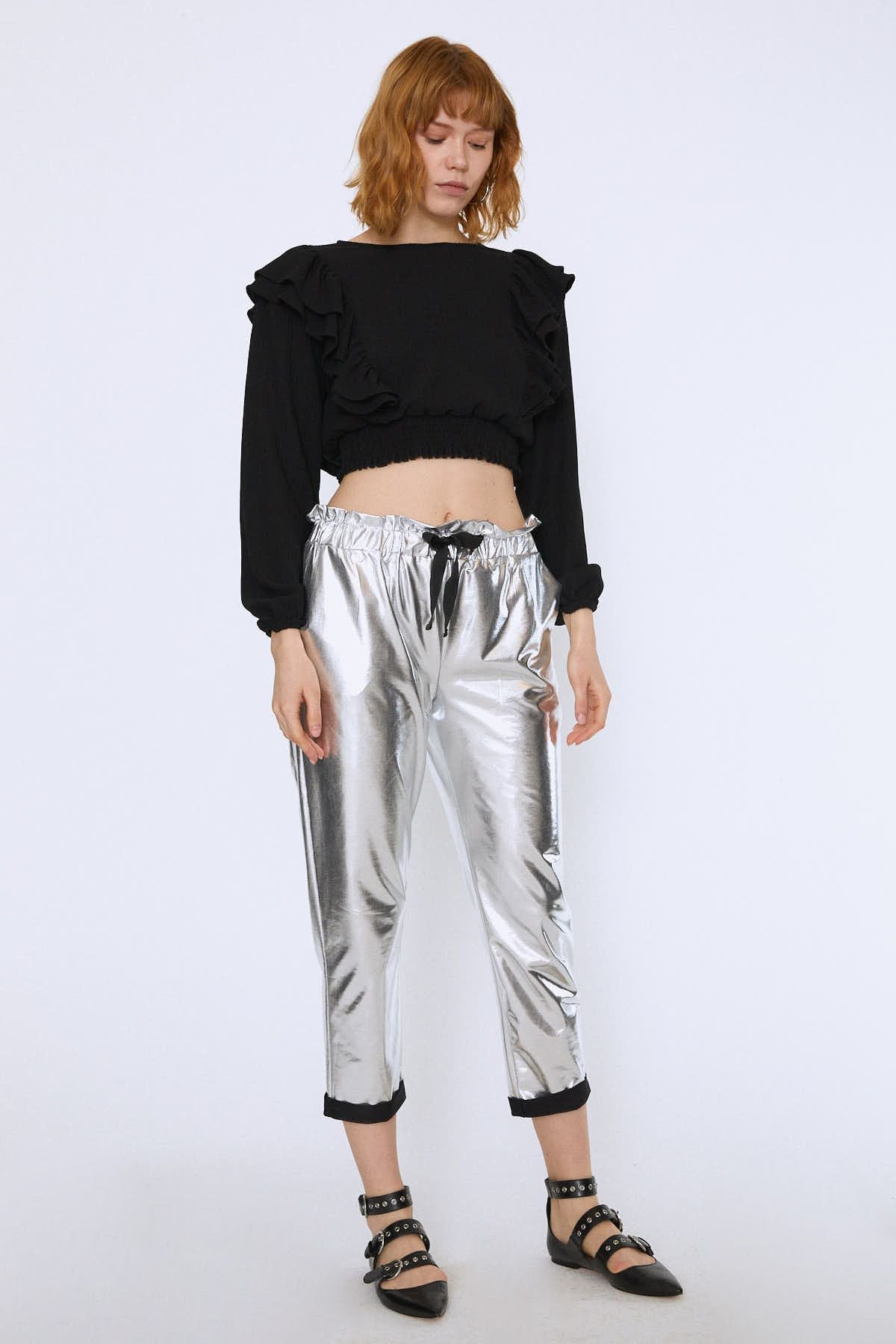 Inviting to style with its sparkle, tie-waist jogger trousers will reflect you with its assertive stance. You can complete the trousers, which will be one of the iconic pieces added to your closet, with cropped blouses.