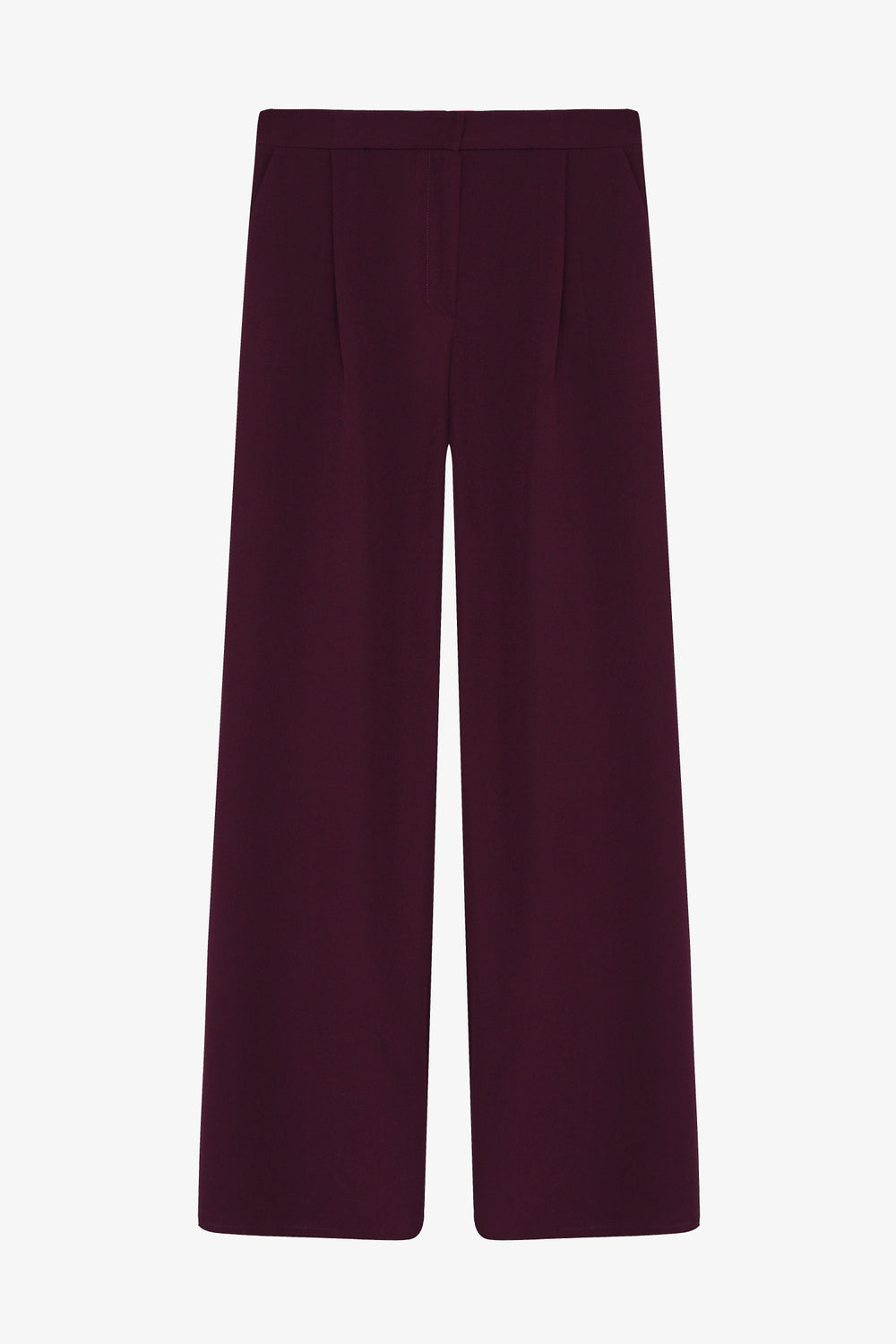 Düz kesim, yüksek bel, yan cepli, fermuarlı ve kanca kapamalı, pile detaylı, uzun boy, bol paça kumaş pantolon.
