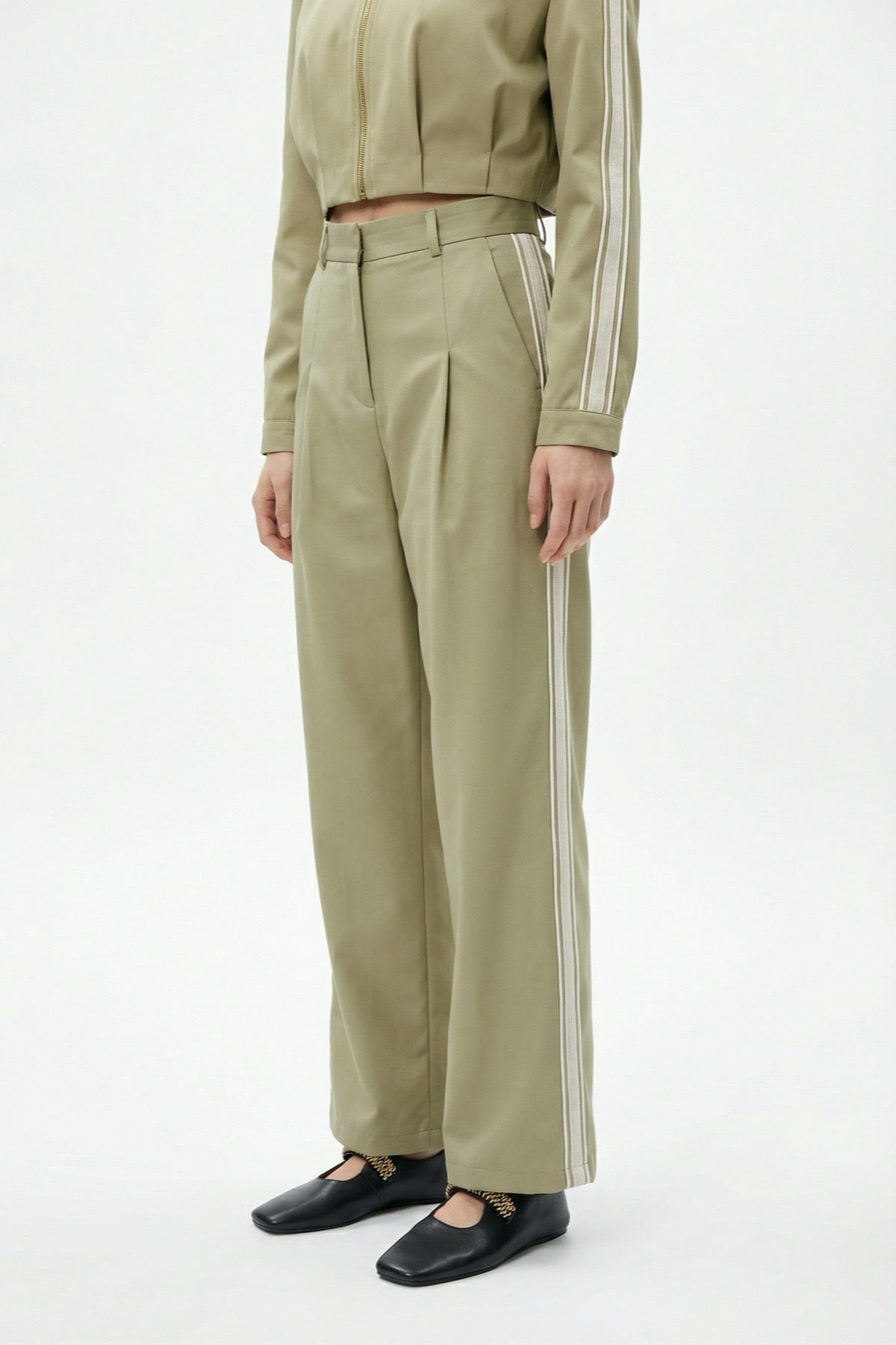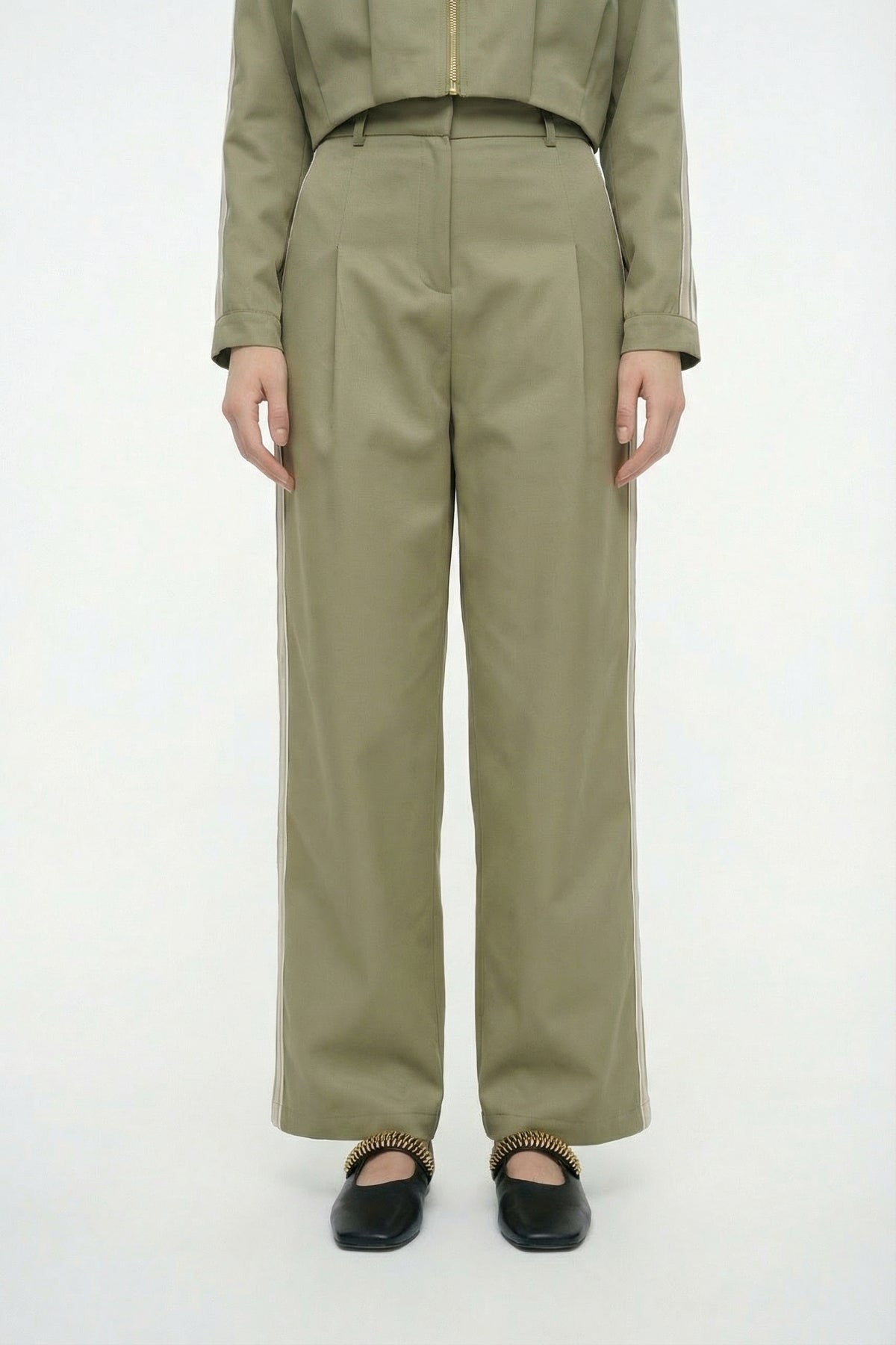 Ön Pileli Şeritli Bol Paça Pantolon Haki
