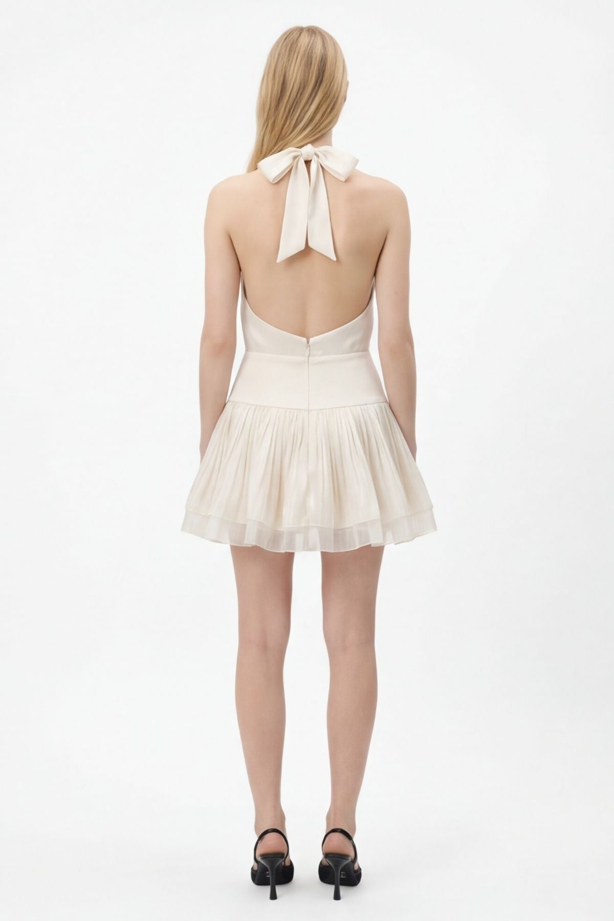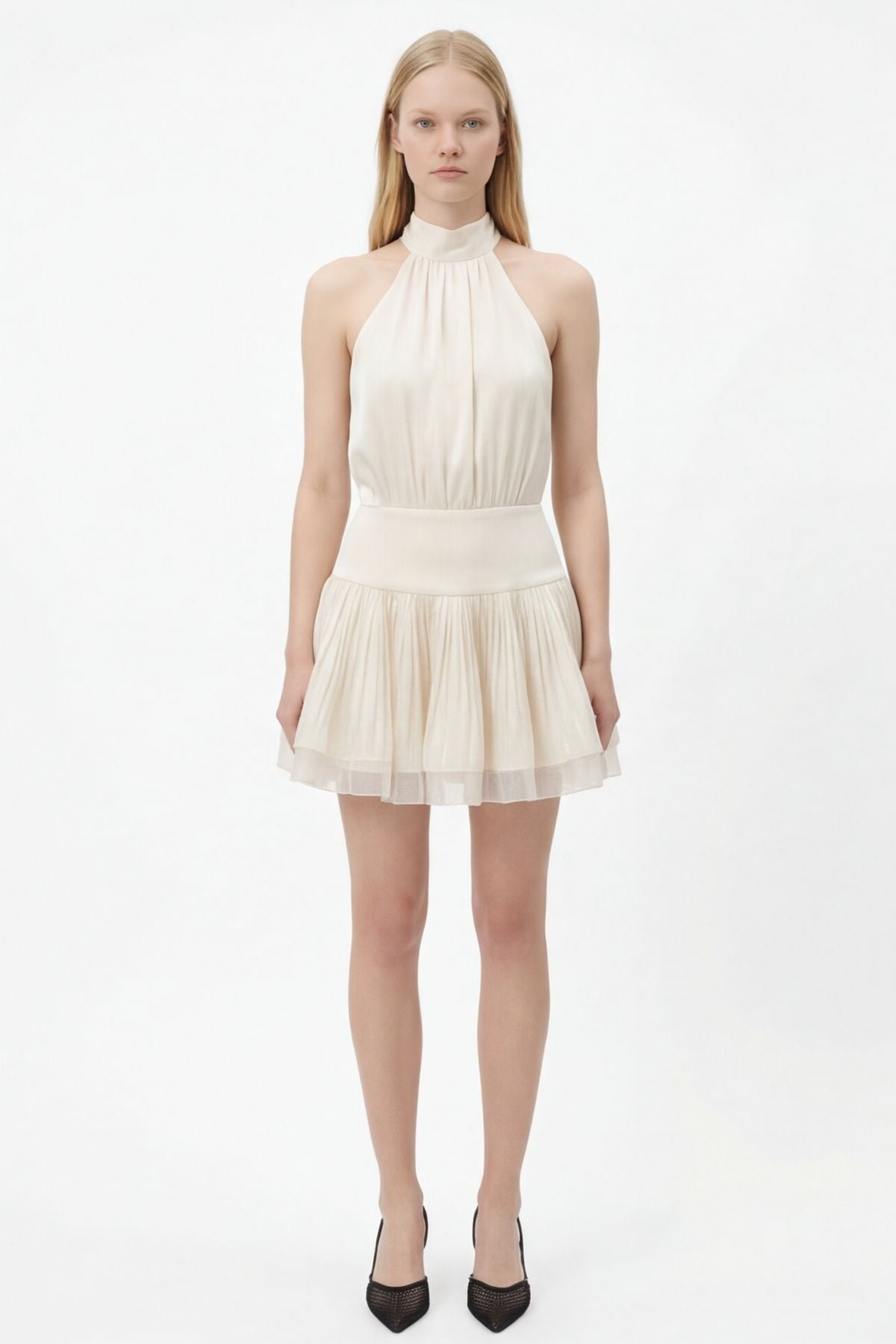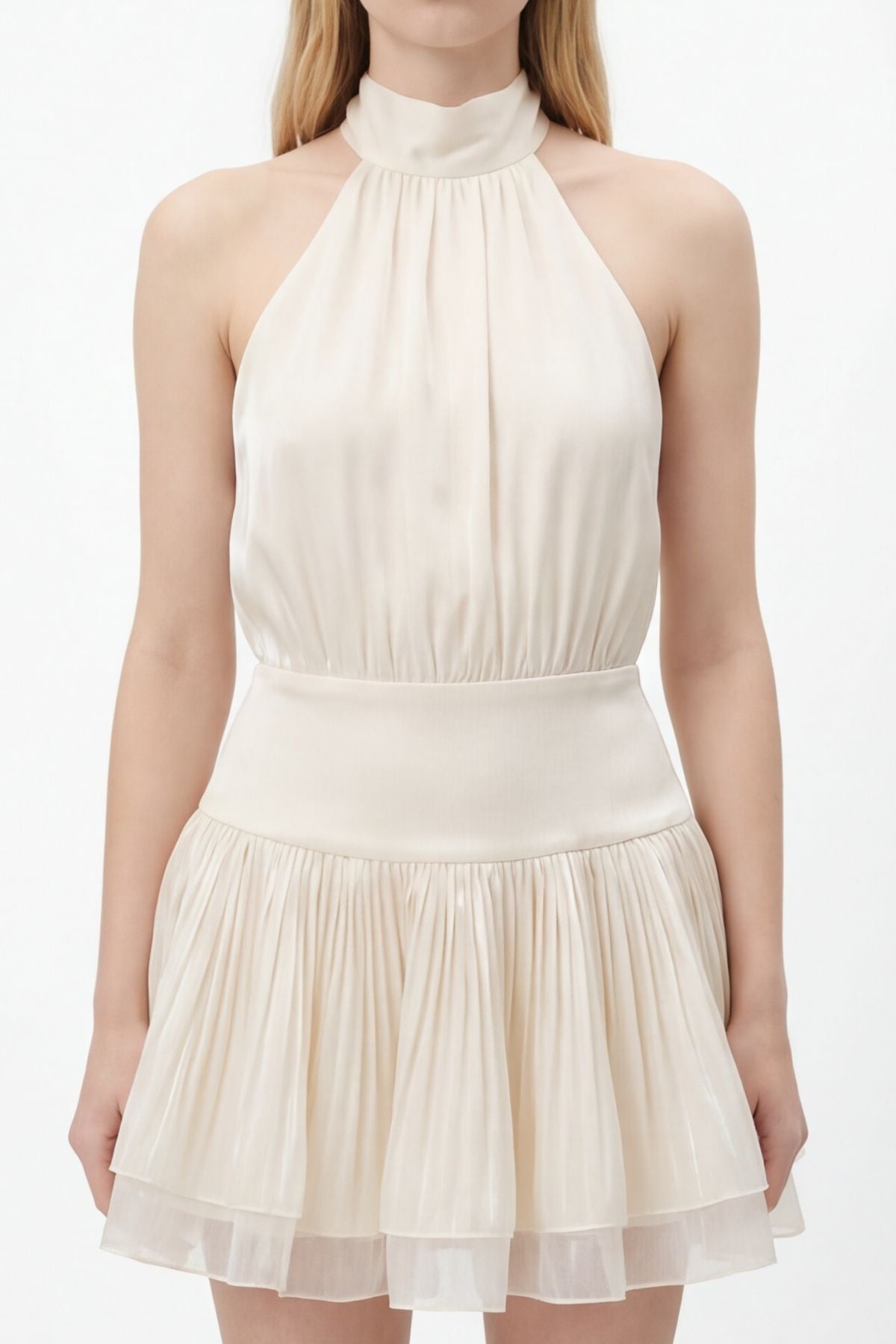 Boyundan Bağlamalı Volanlı Mini Elbise Bej