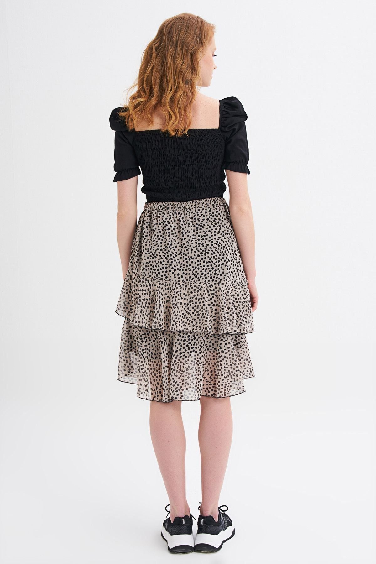 This skirt, which has a retro feel with its polka dot patterns and can easily fit a sporty combination with a simple blouse with its modern cut, is ready to be with you in every moment of summer.