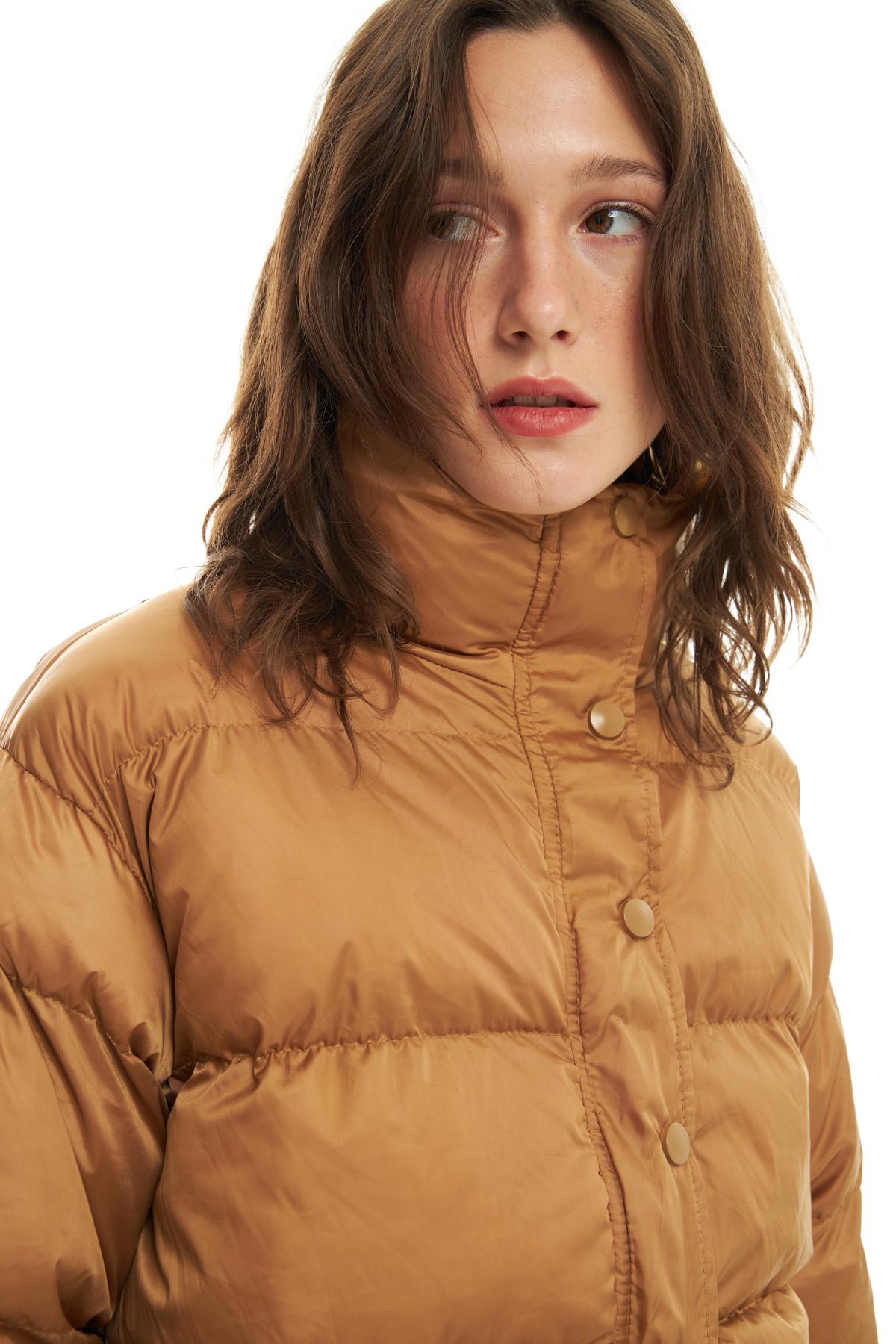 Short puffer coat with two pockets, zip fly and snap button fastening, long sleeves, elasticated sleeves, puff-padded, high collar