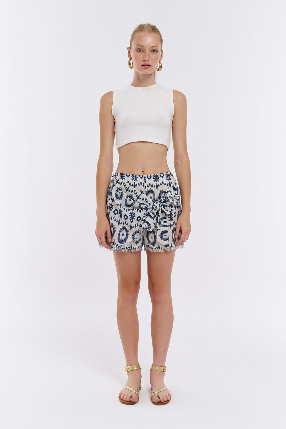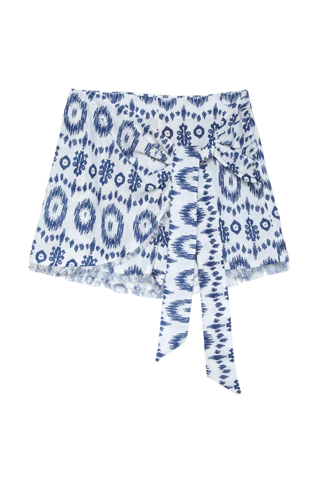 Desenli, önü bağlama detaylı, mini boy şort etek.