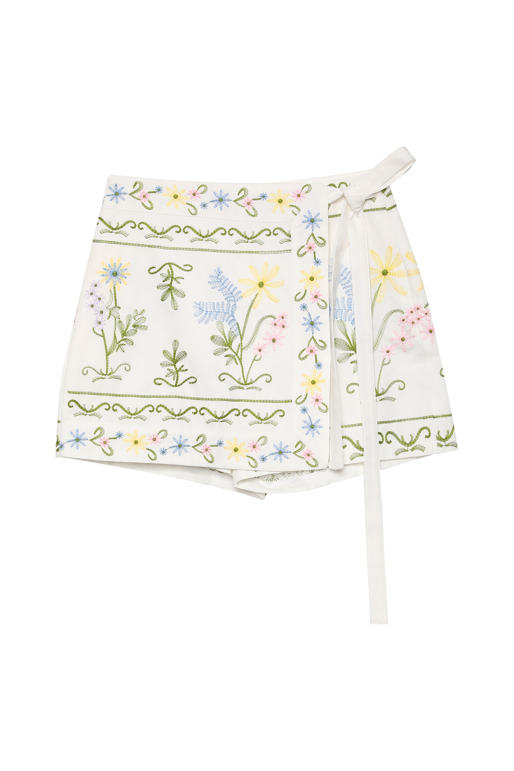 Çiçek Nakış Detaylı Bağlamalı Şort Etek Ekru