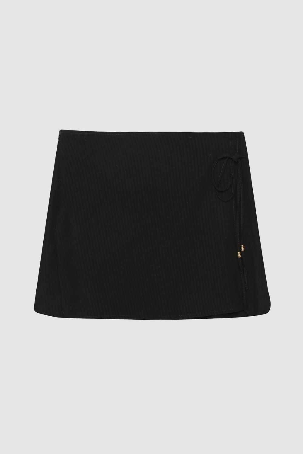 Yan kısmı aksesuar bağlamalı, çizgili dokulu kumaştan, arkası şort görünümlü, mini boy şort etek.