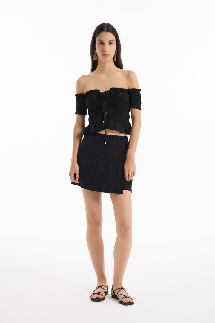 Dokulu Bağcık Detaylı Şort Etek Siyah