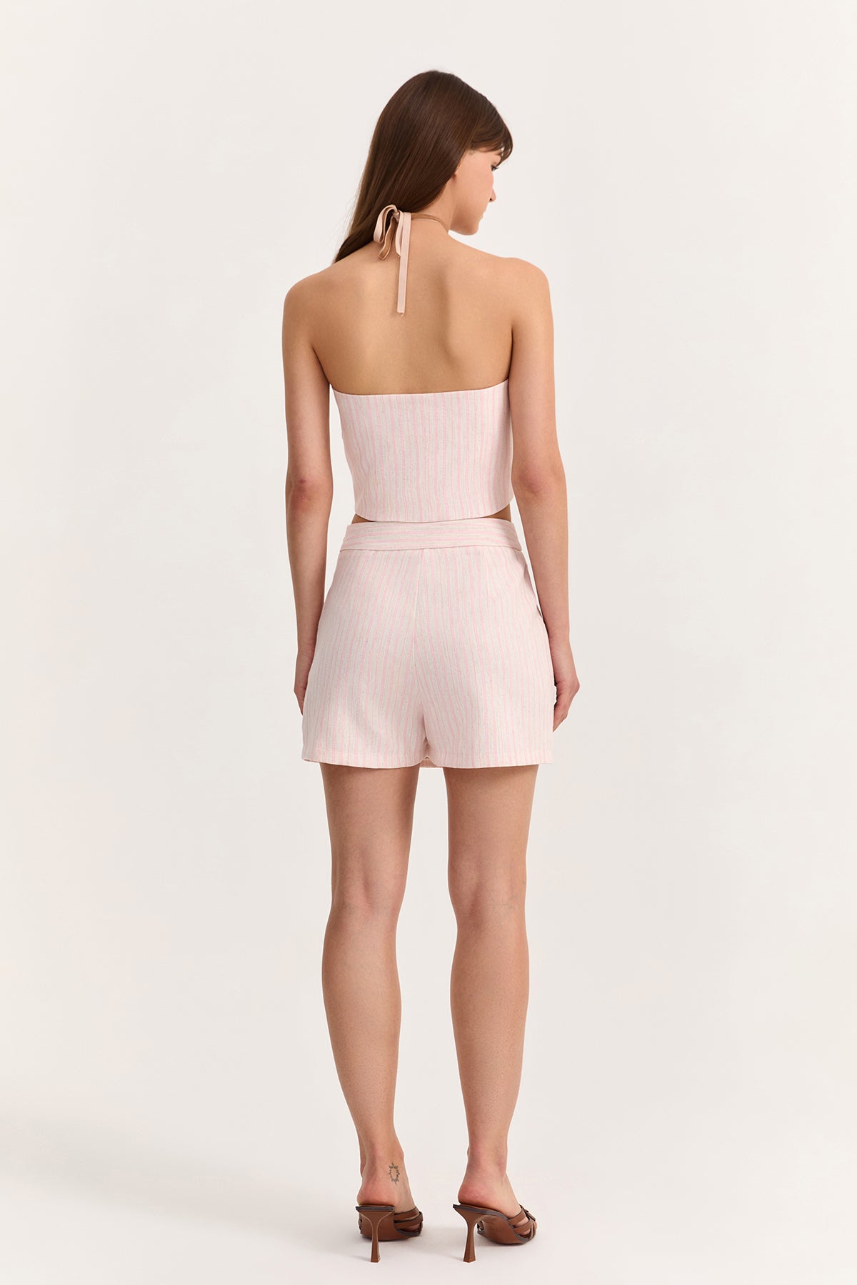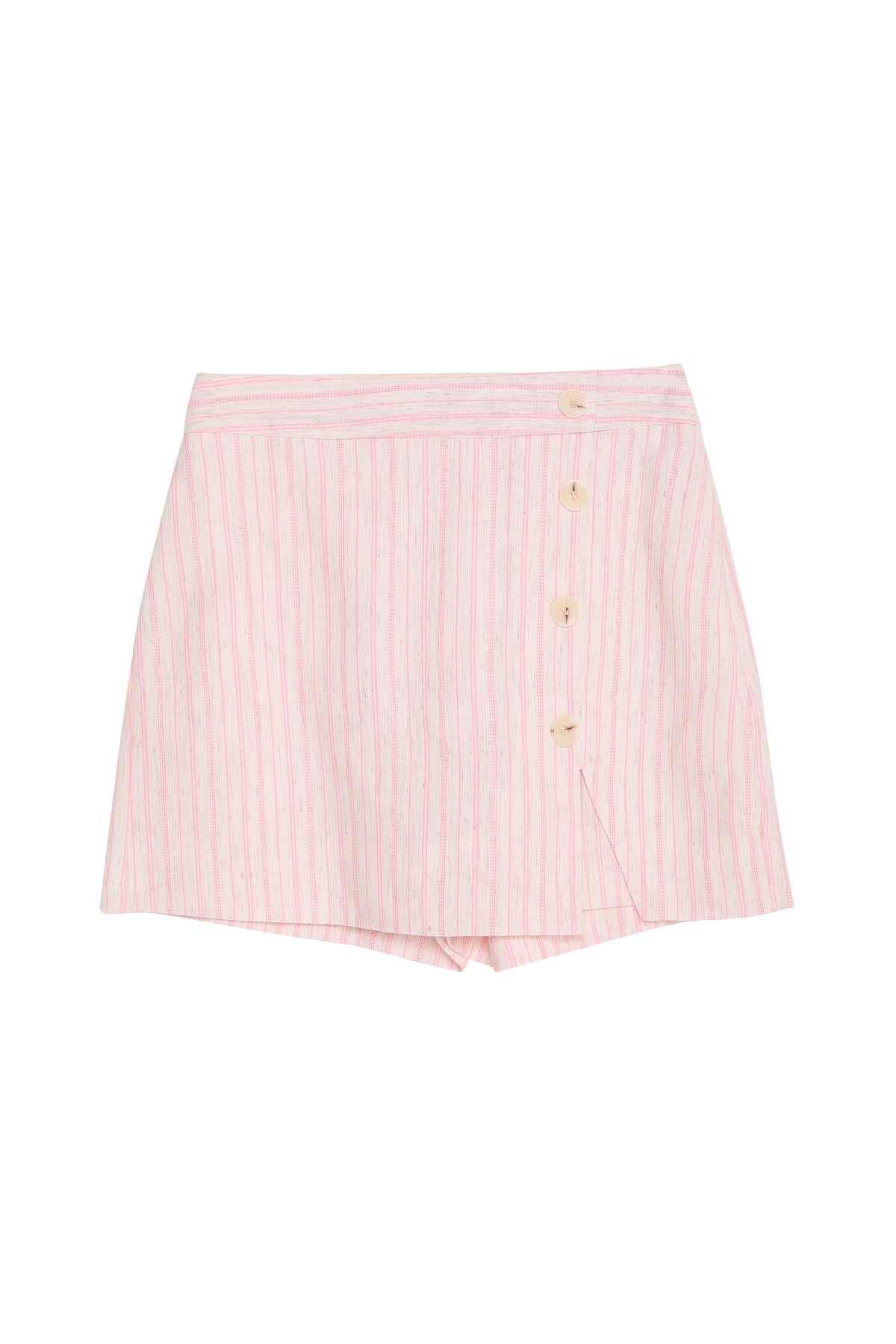 Düğme Aksesuarlı İnce Çizgili Keten Şort Etek Pembe