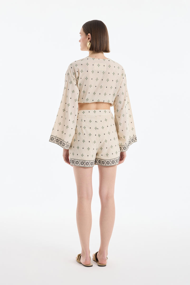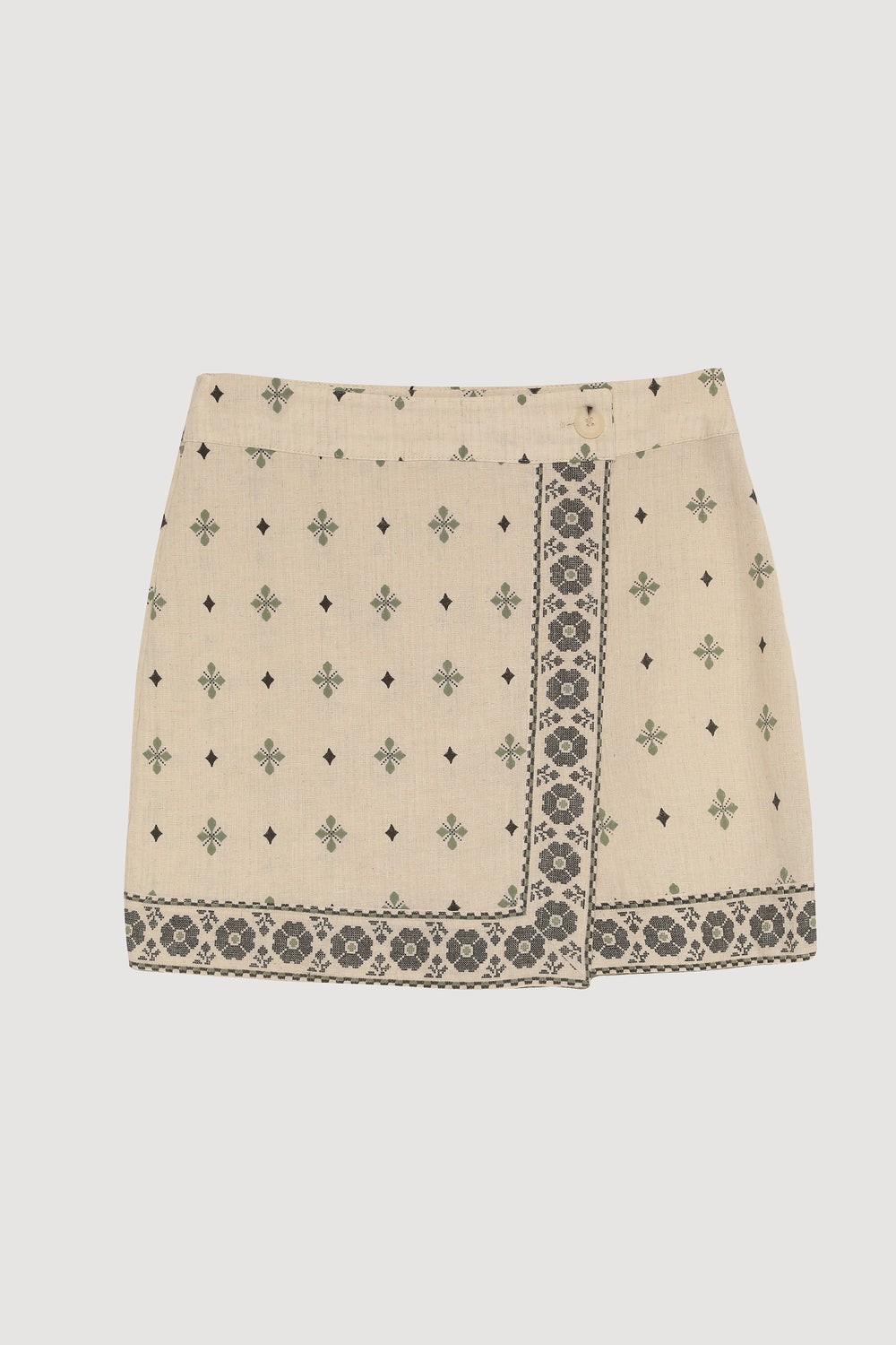Etek formunda tasarlanmış, içi tek taraflı şort astarlı, etnik desenli bordür detaylı, yandan fermuar kapamalı, önü çapraz düğmeli, keten mini şort etek.