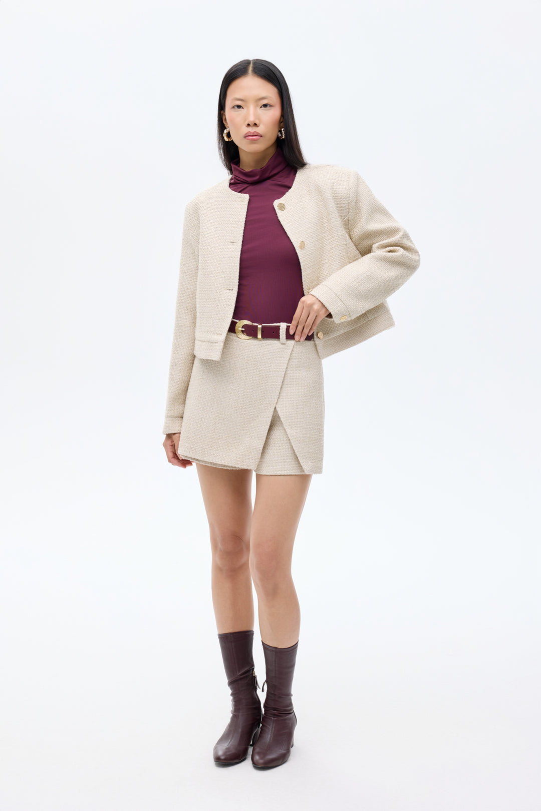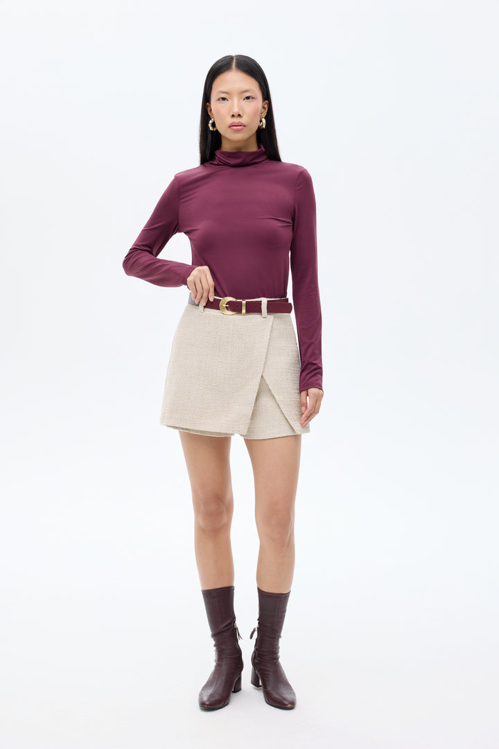 İçi şortlu, kemer detaylı, çapraz kapamalı, yandan fermuar kapamalı, mini boy tüvit şort etek.