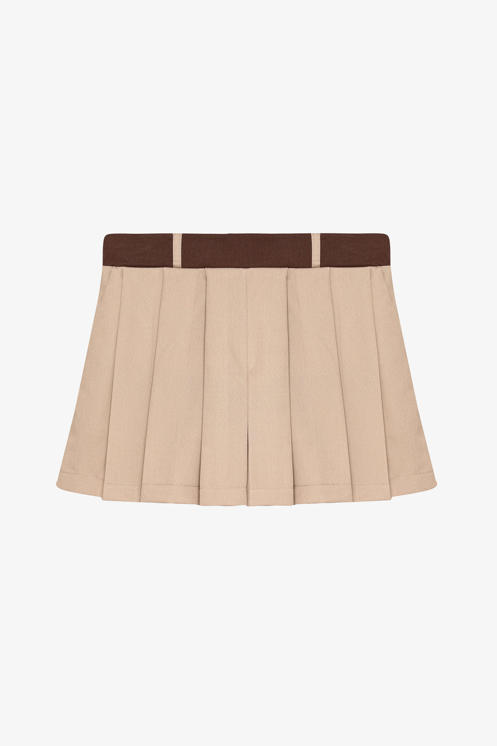 Kontrast Bel Pileli Mini Şort Etek Bej