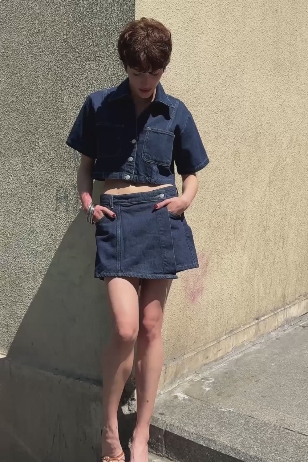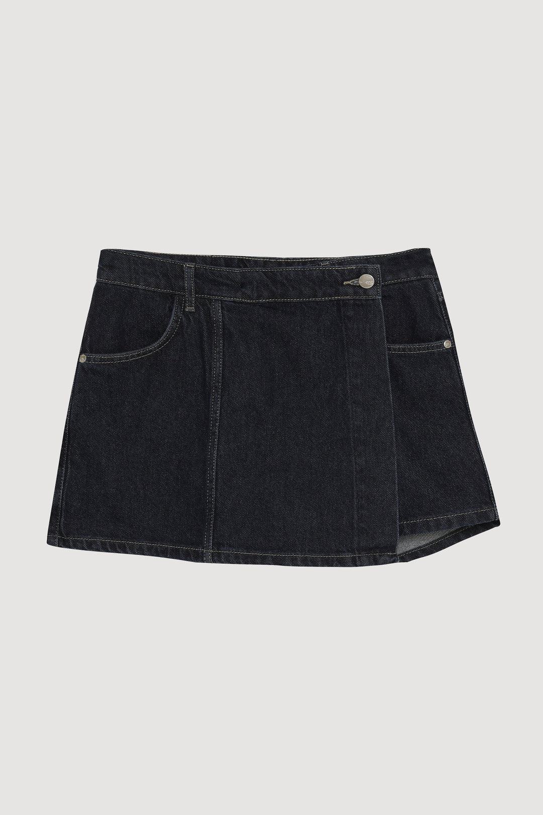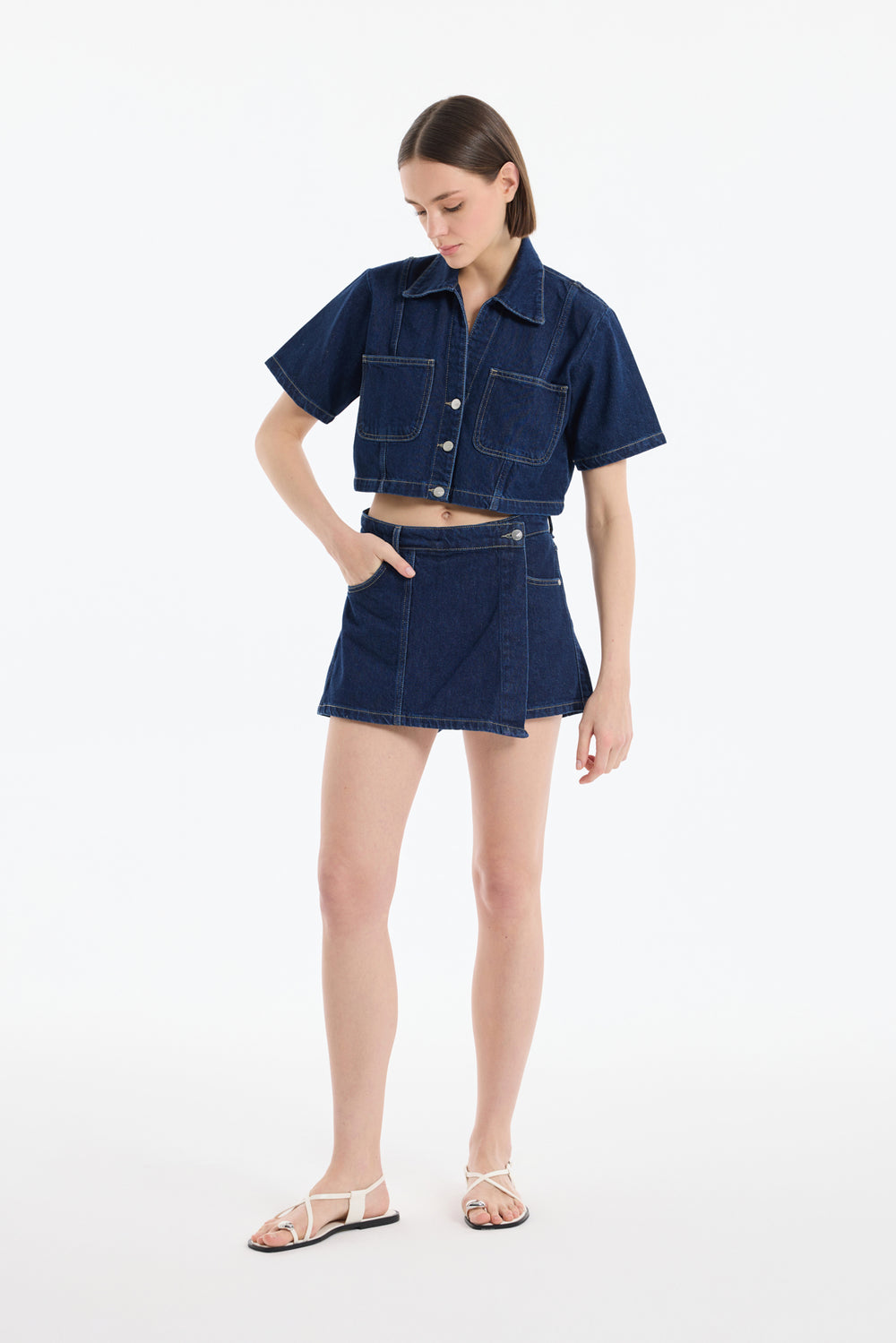 İçi şortlu, asimetrik etek kesimli, çift cepli, düğme ve fermuar kapamalı, denim kumaştan, modern görünüm sunan mini boy şort etek.