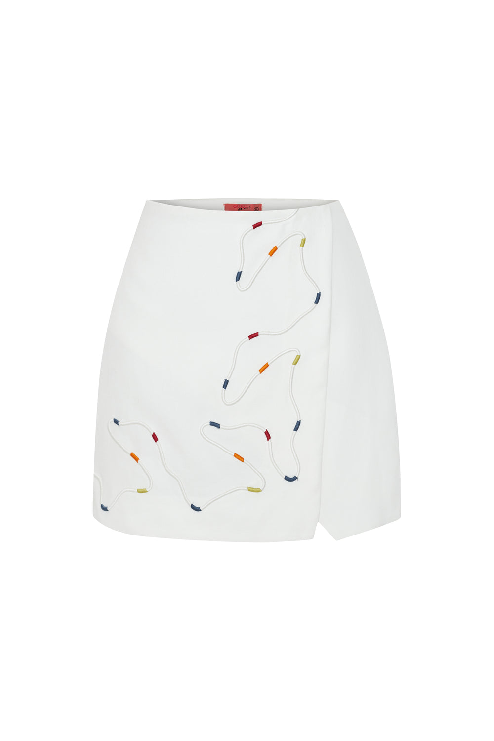 Çiçek Nakış Detaylı Bağlamalı Şort Etek Ekru