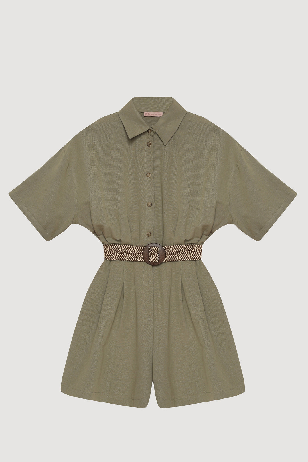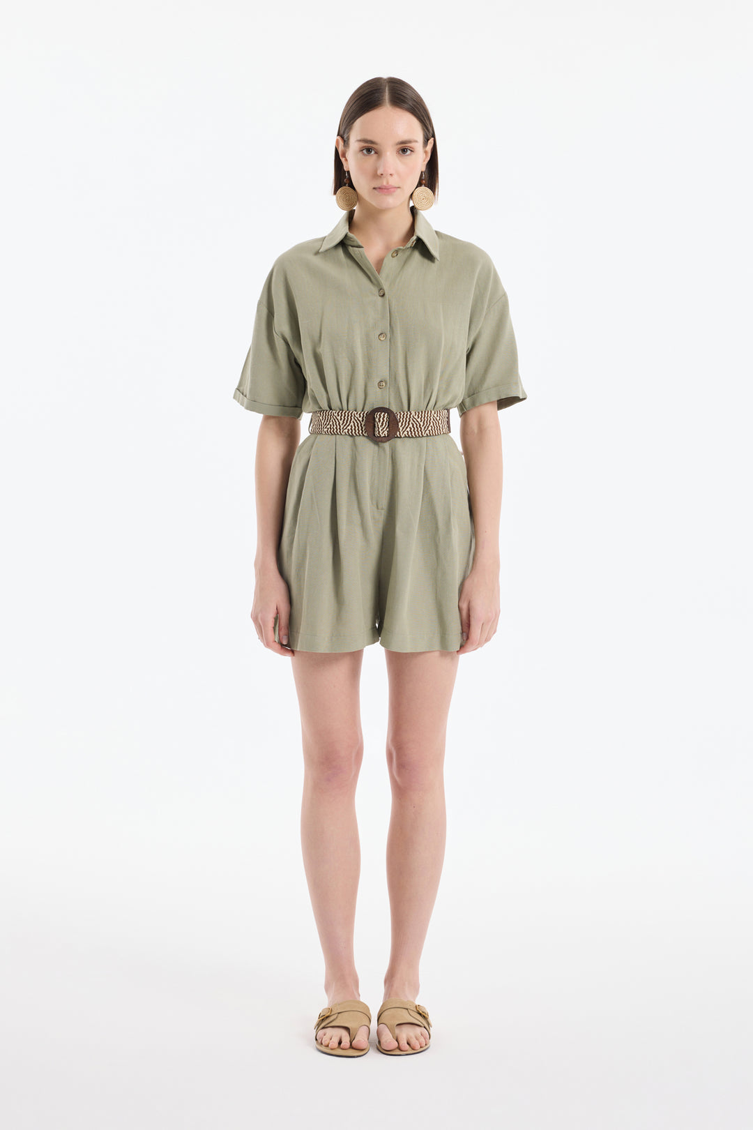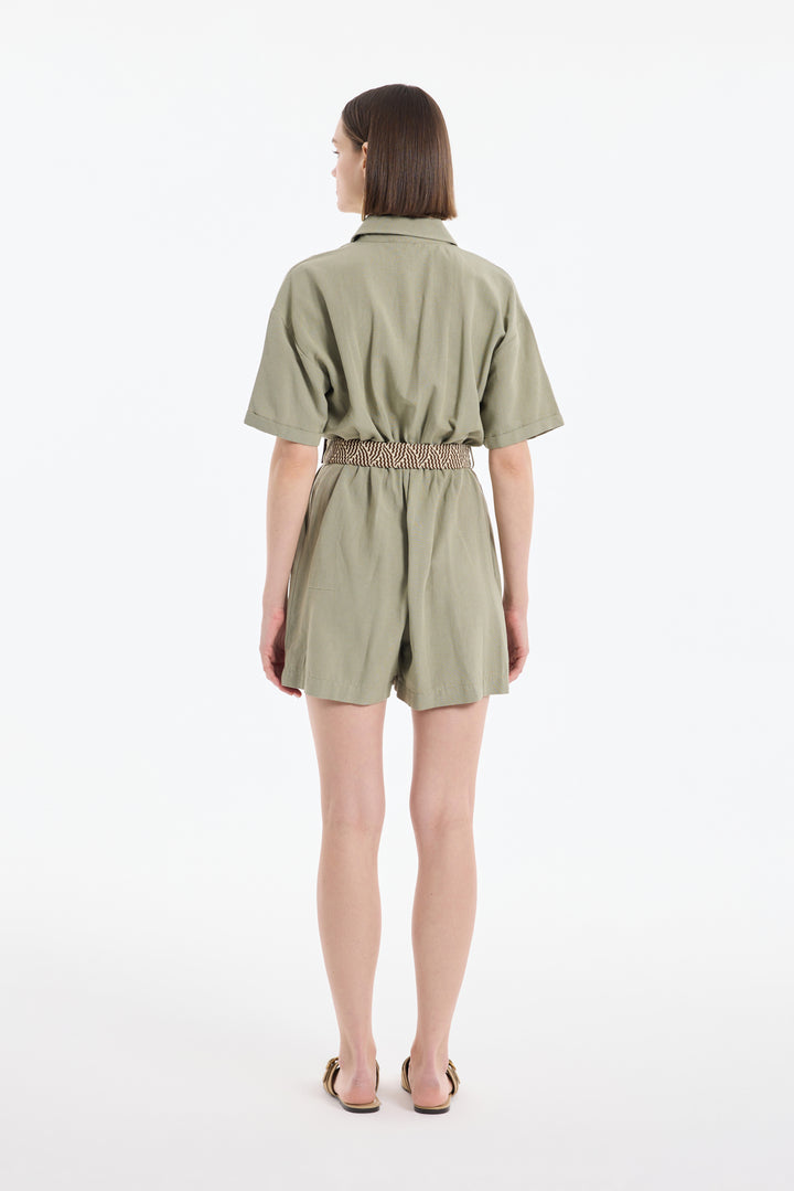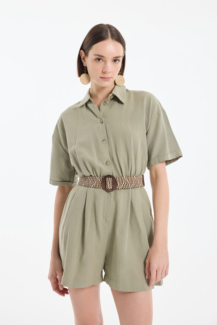 Gömlek Yaka Kemerli Keten Şort Tulum Haki