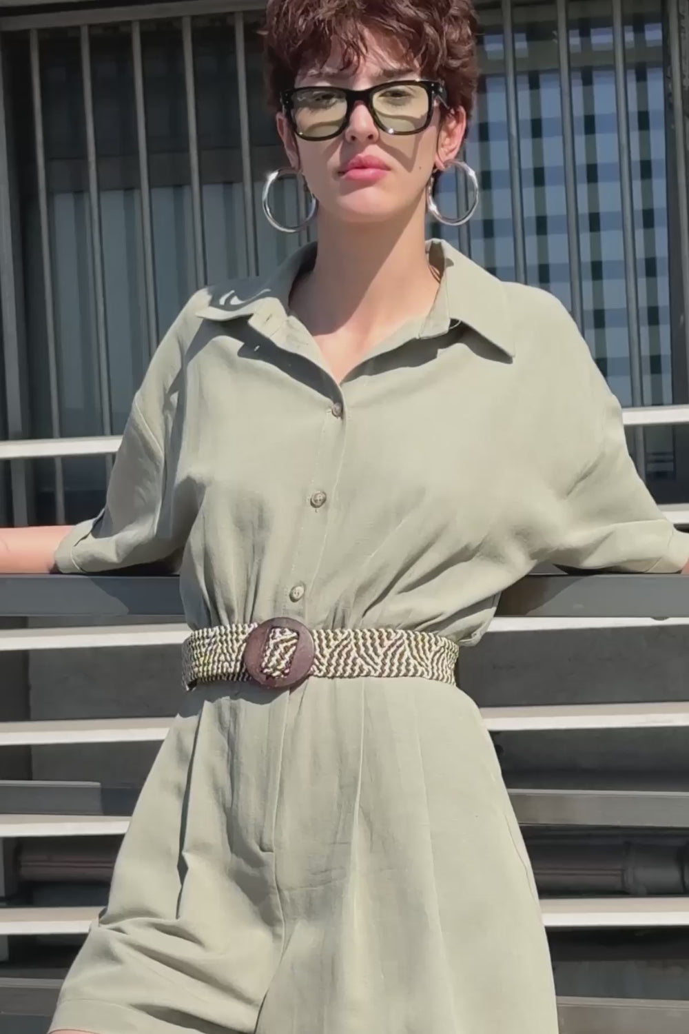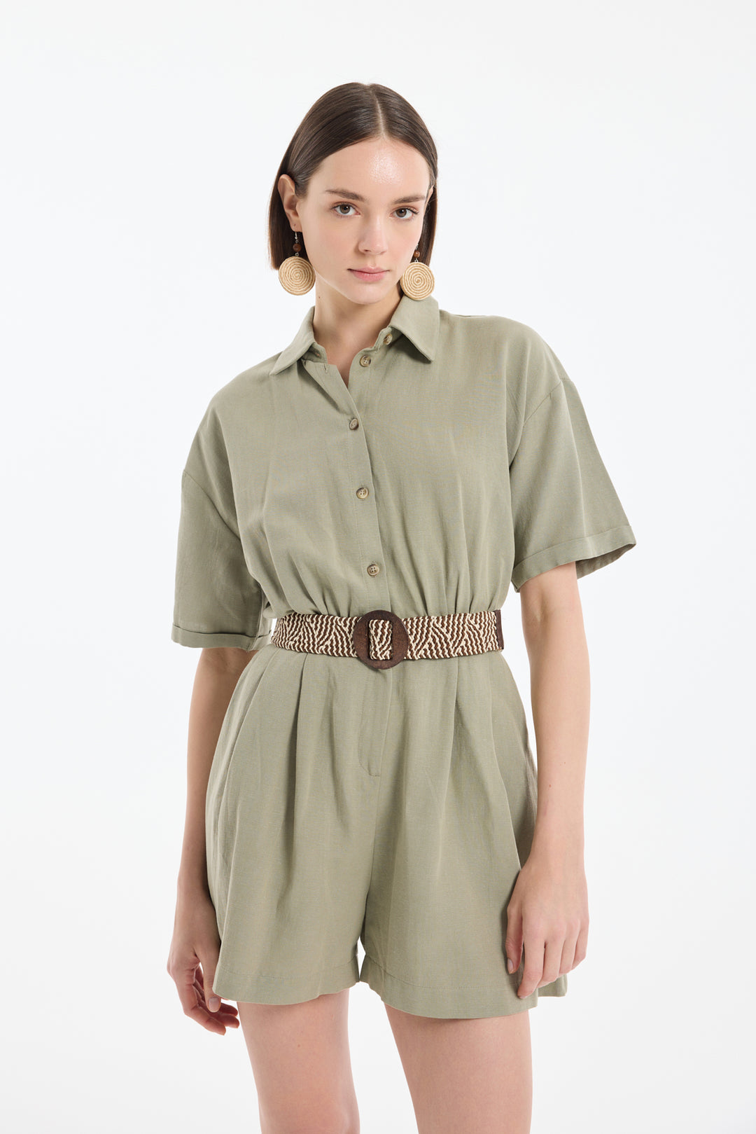 Hasır kemer detaylı, kısa kollu, gömlek yaka, astarsız, önden düğme ve fermuar kapamalı, rahat kesim, çift cepli, mini boy keten şort tulum.