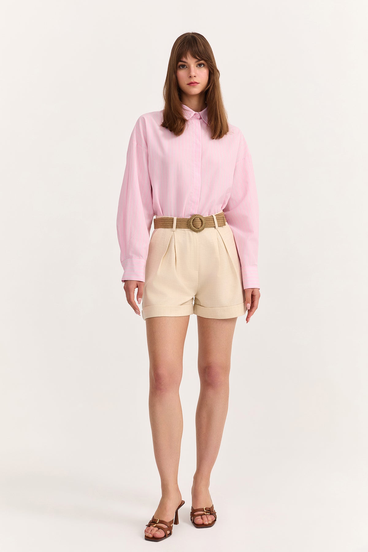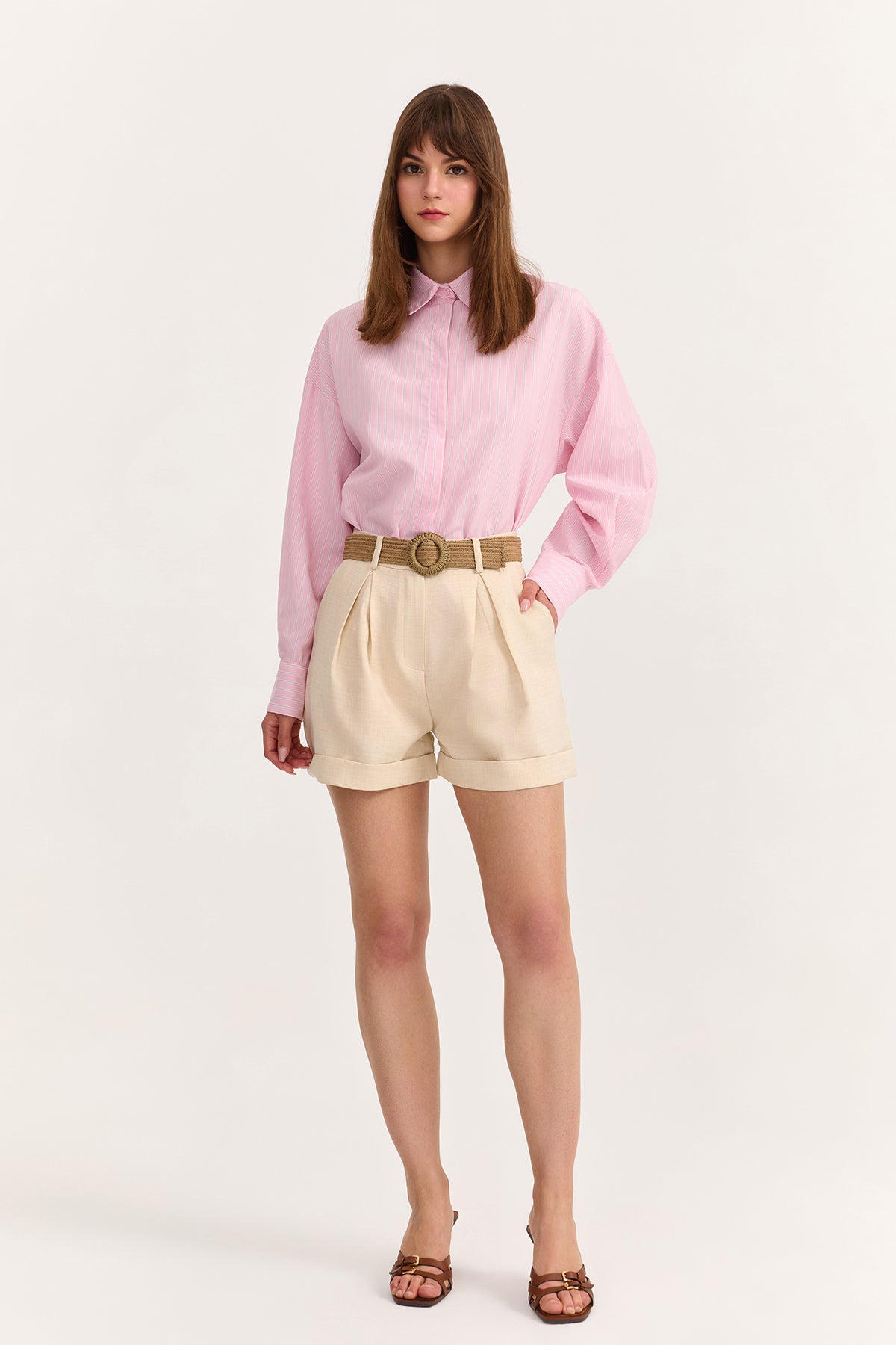 Hasır kemer aksesuarlı, duble paça, çift cepli, mini şort.