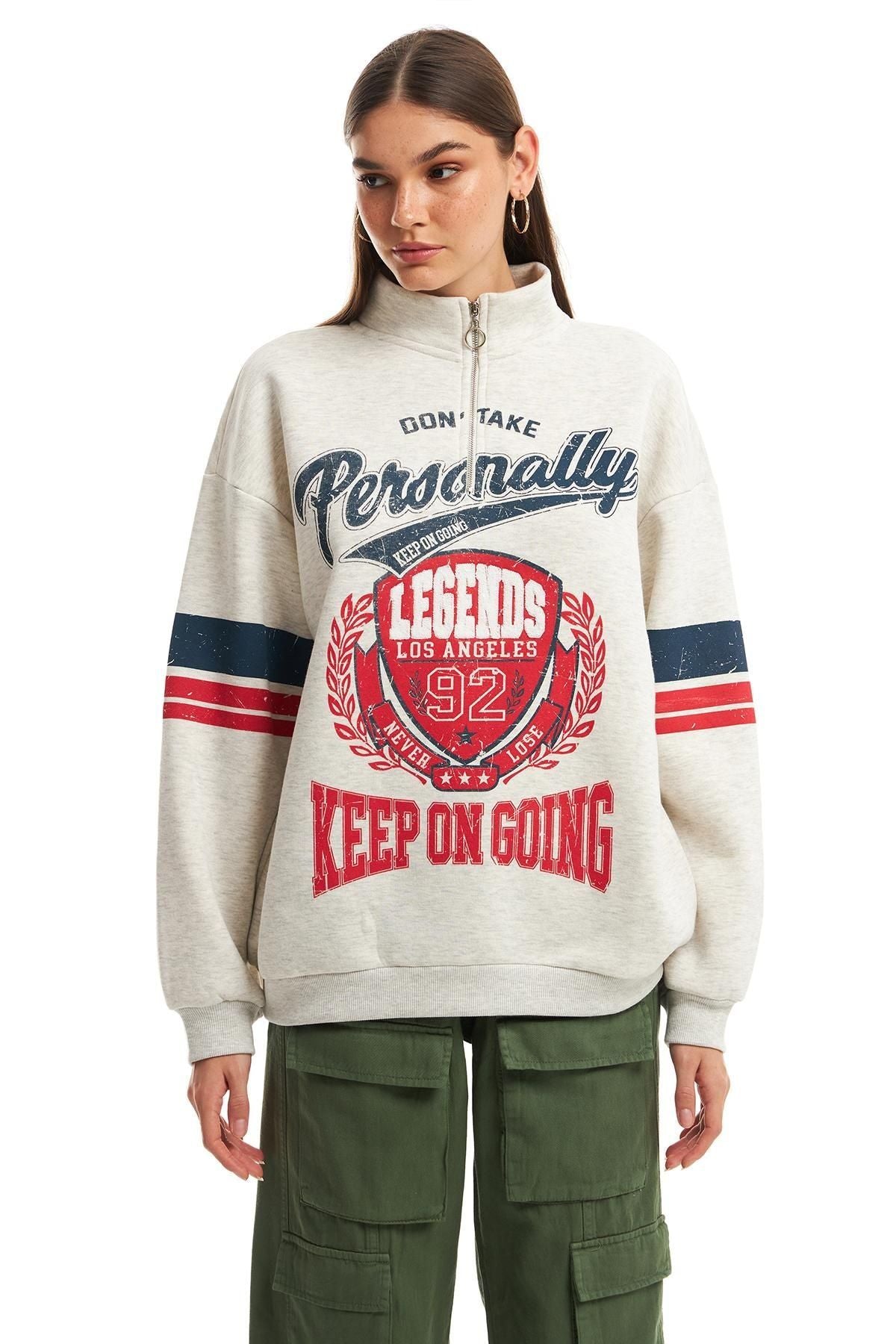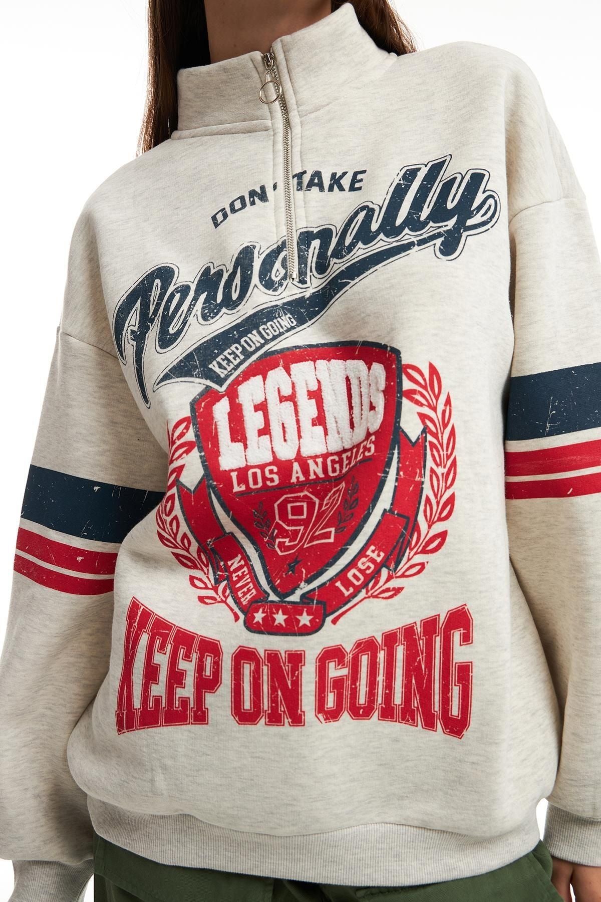Oversized sweatshirt with cotton content, long sleeves, zip fastening on the collar, printed on the front and sleeves.