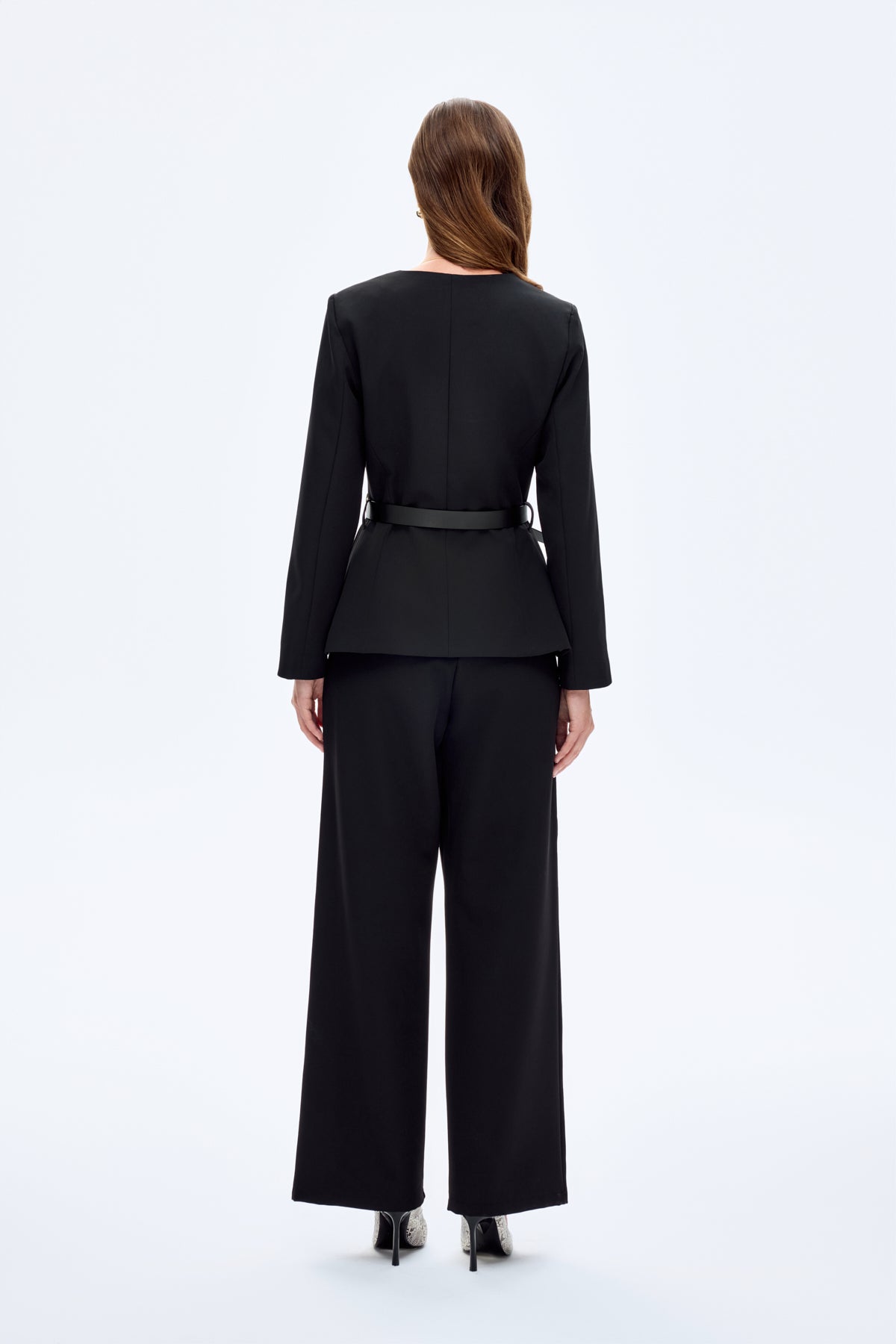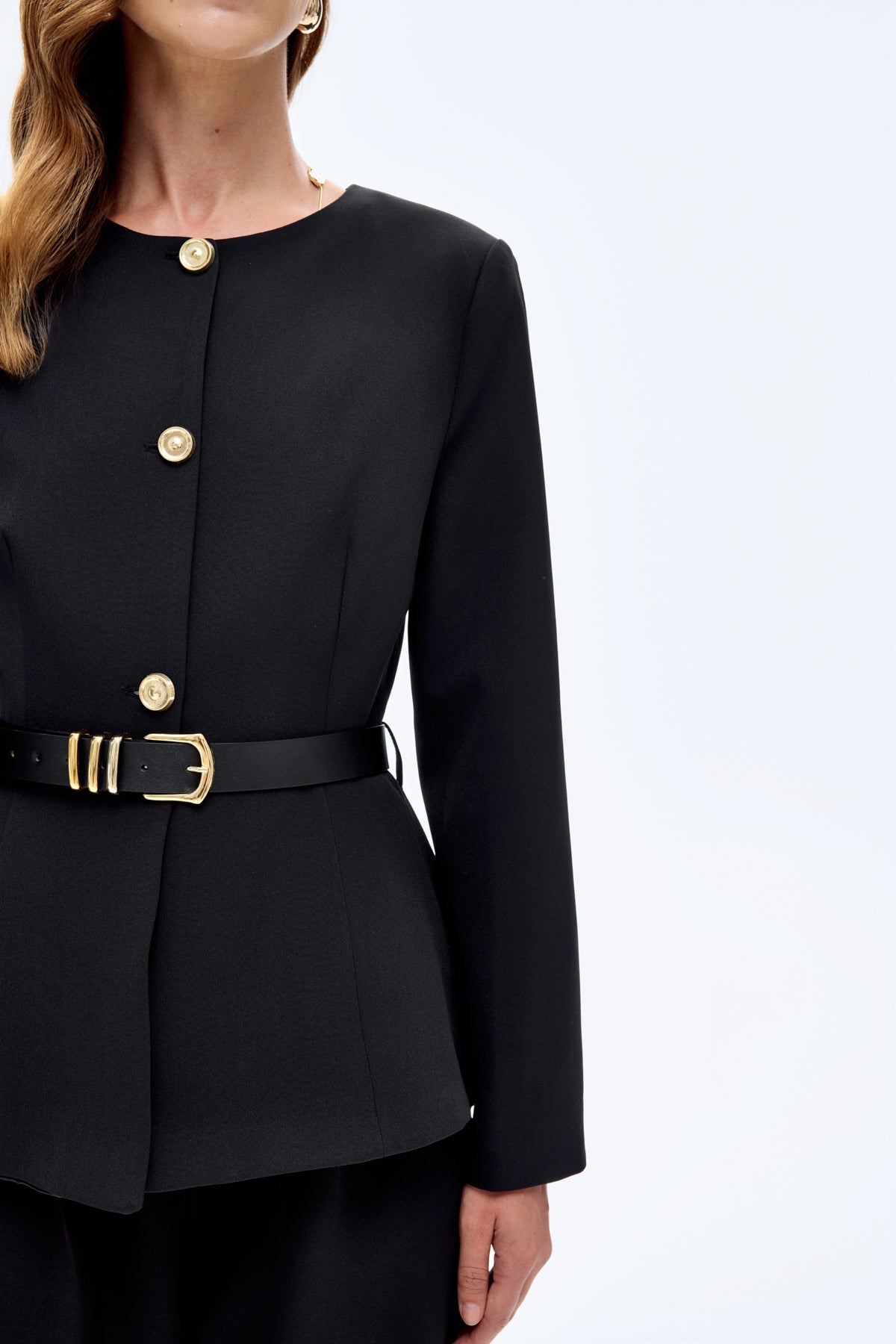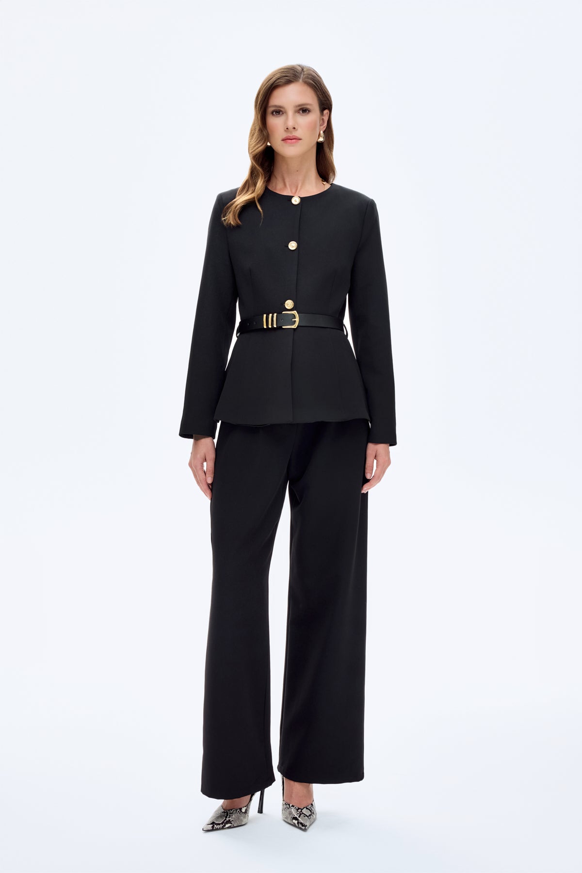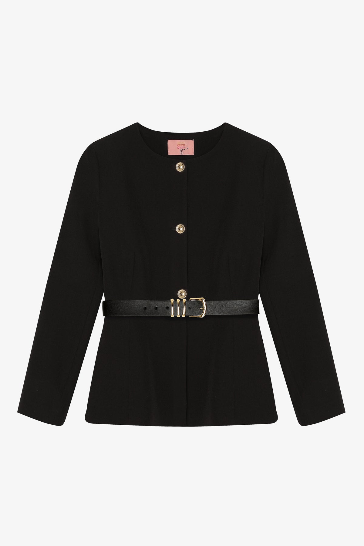 Kemer Aksesuarlı Yuvarlak Yaka Ceket Siyah