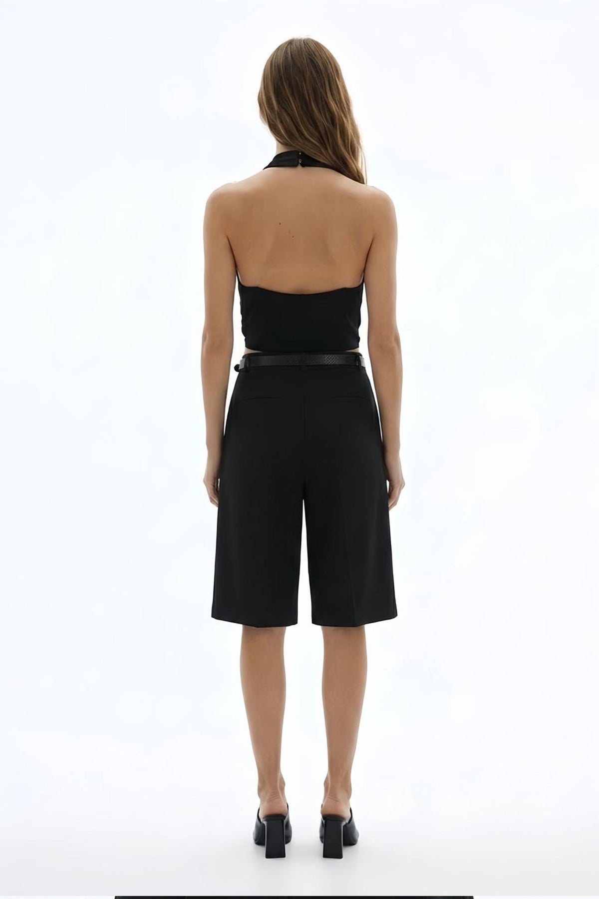 Yüksek bel, ince kemer detaylı, önden pileli, yan cepli, fermuar ve agraf kapamalı, diz altı boy, geniş paça, bermuda form şort.