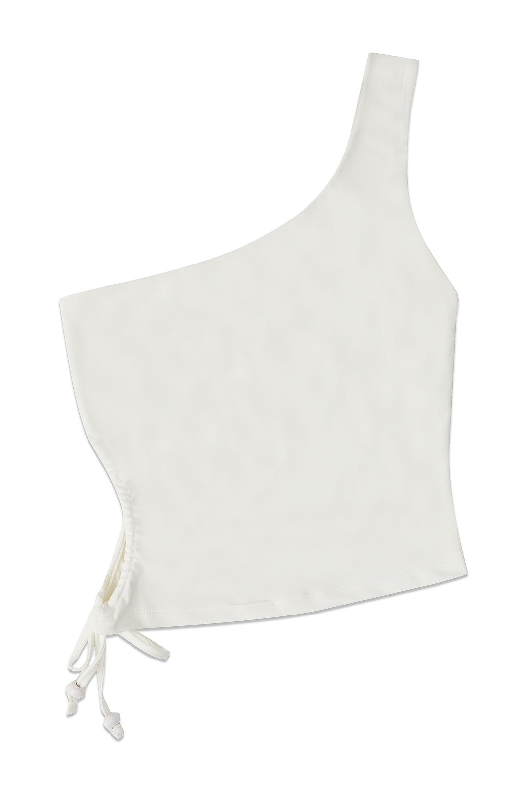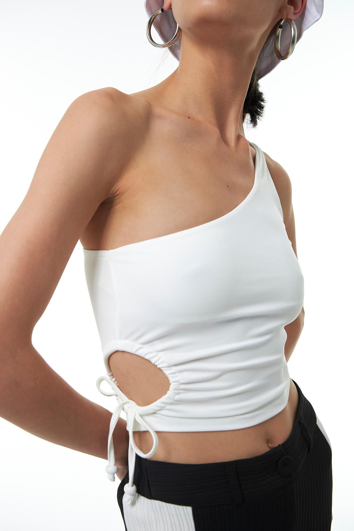 Crop blouse model draws attention with one shoulder and gathered cut-out details. You can create an effortless elegance by combining the one-shoulder blouse model with our high waist trousers or skirt models.