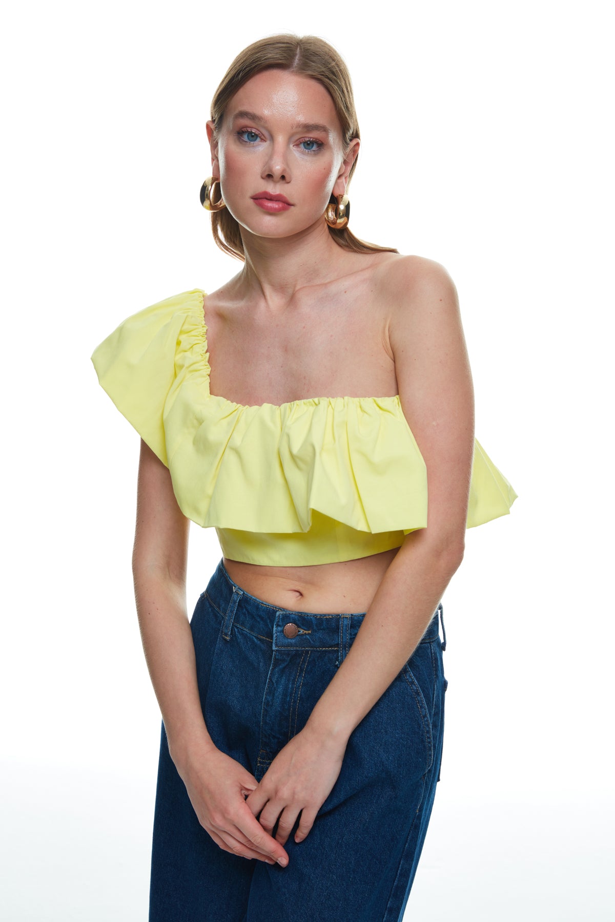 Ruffle Detailed One-Shoulder Crop Blouse Yellow