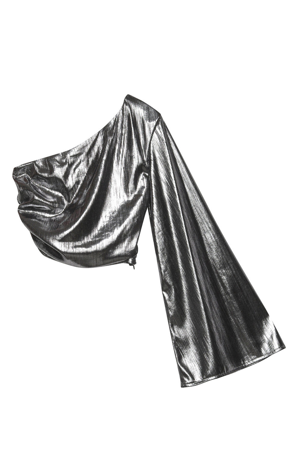 Tek omuz, parlak metalik dokulu, büzgü detaylı, geniş kol crop bluz.