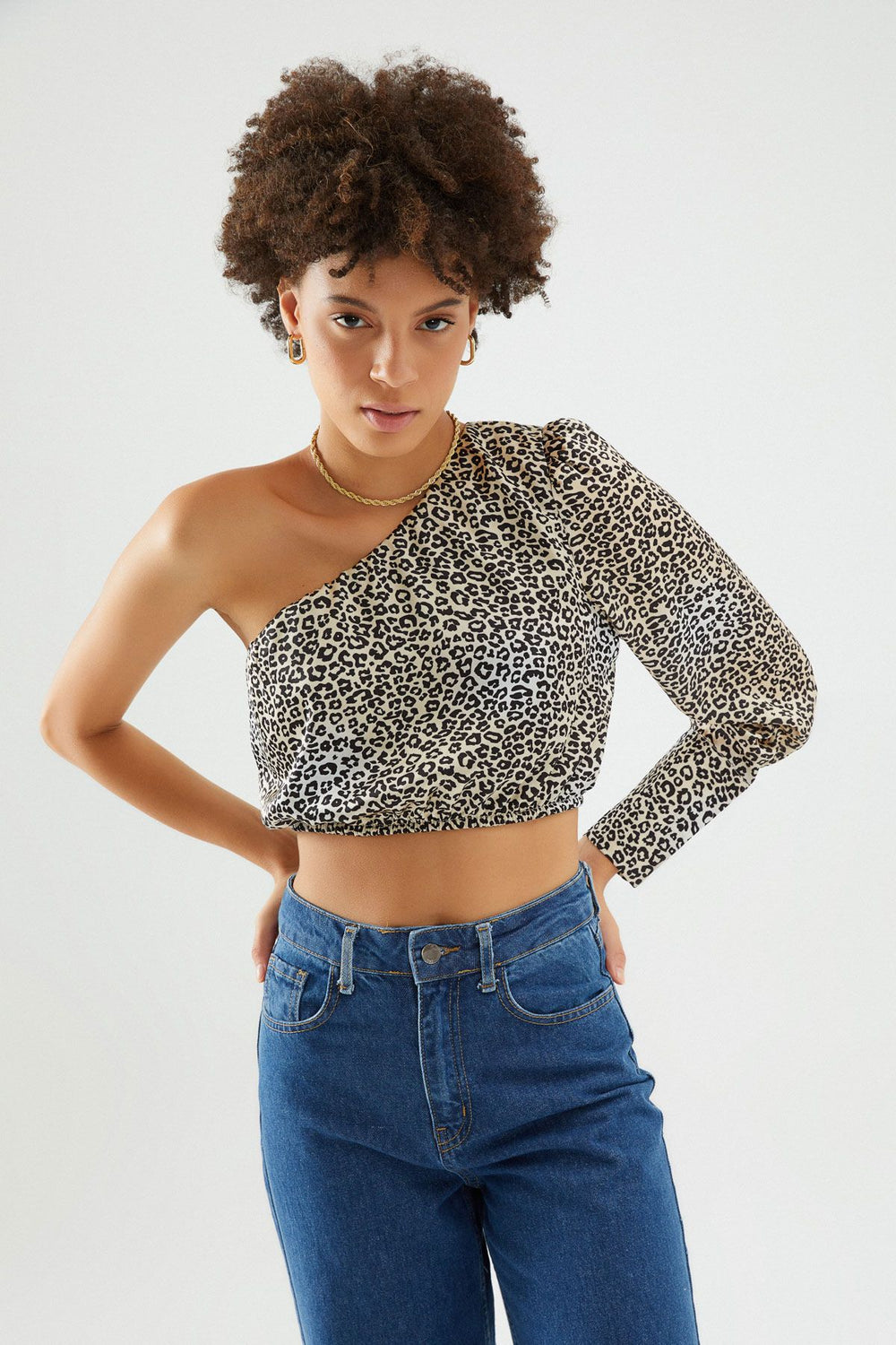 Leopard One Shoulder Satin Blouse Brown