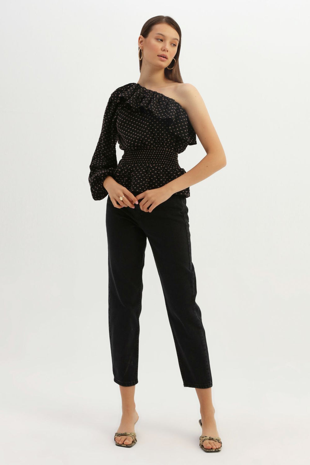 Ruffled Gippie One Shoulder Blouse Black