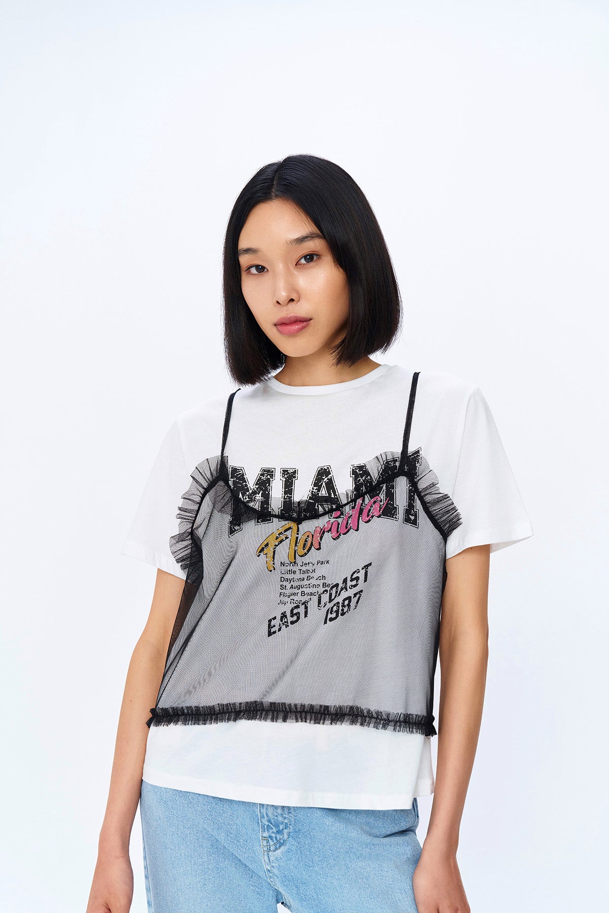 Askılı Tül Organze Baskılı Tişört Ekru