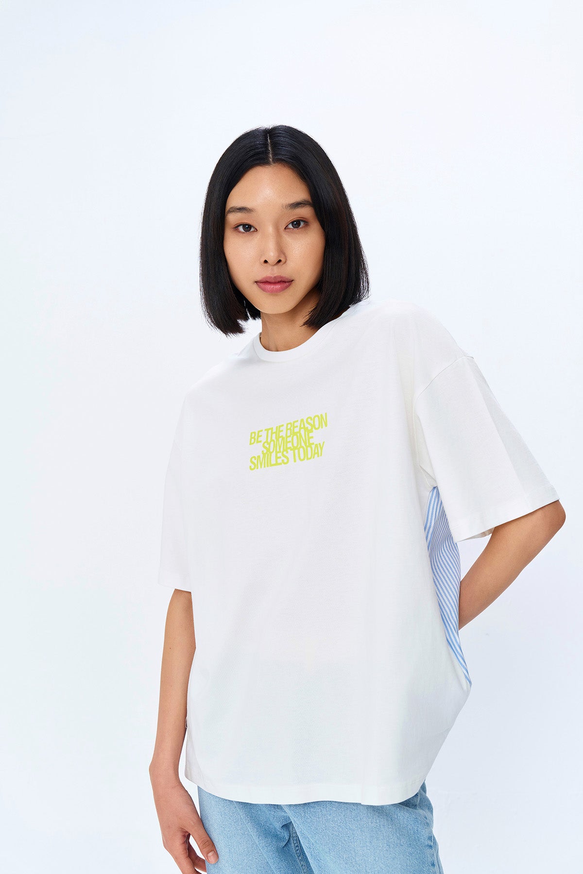 Sırtı Çizgili Neon Yazılı Tişört Ekru