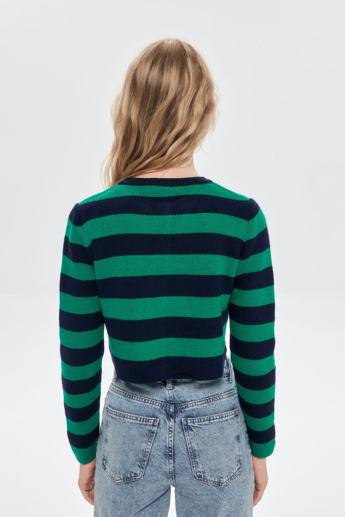 Çizgili Düğme Detaylı Crop Hırka Laci-Yeşil